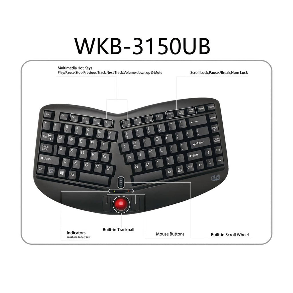 The Adesso TruFrom Media 3150 Ergonomic Keyboard is a great way to keep your hands and wrists in a natural position while typing. An integrated palm rest also ensures your wrists stay in a comfortable position. Its compact size means you're also easily able to take it with you wherever you go. Large print size prevents eye strain.