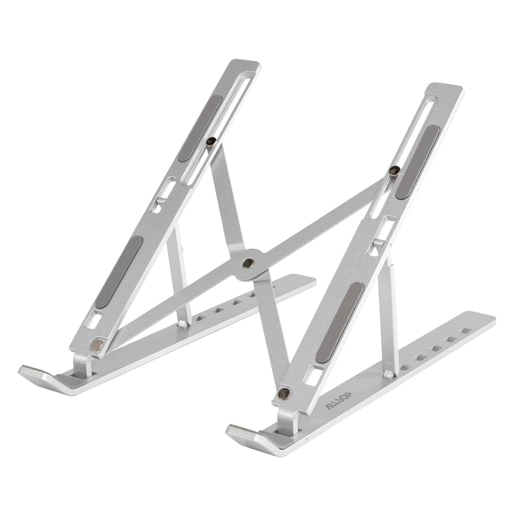 Raise your laptop to an ergonomic viewing height wherever you go with the Allsop Compact Aluminum Laptop Stand. Made from aircraft-grade aluminum, this compact laptop stand features 6 adjustment levels to place your laptop or tablet at the ideal height and angle. Silicone pads on the arms and feet keep the stand and your laptop securely in place. The stand is less than 2-in. wide when folded for transport and comes with a convenient carry bag.