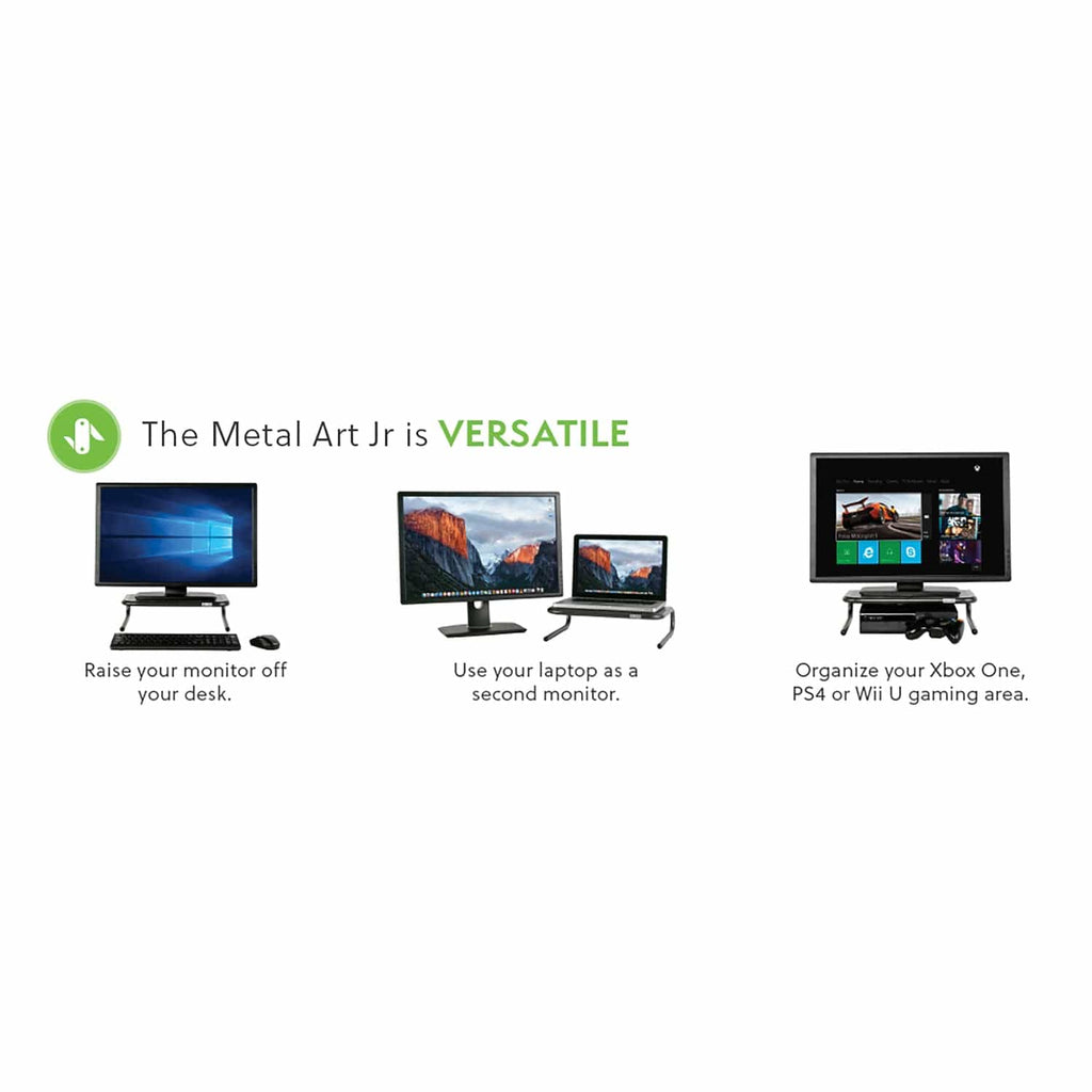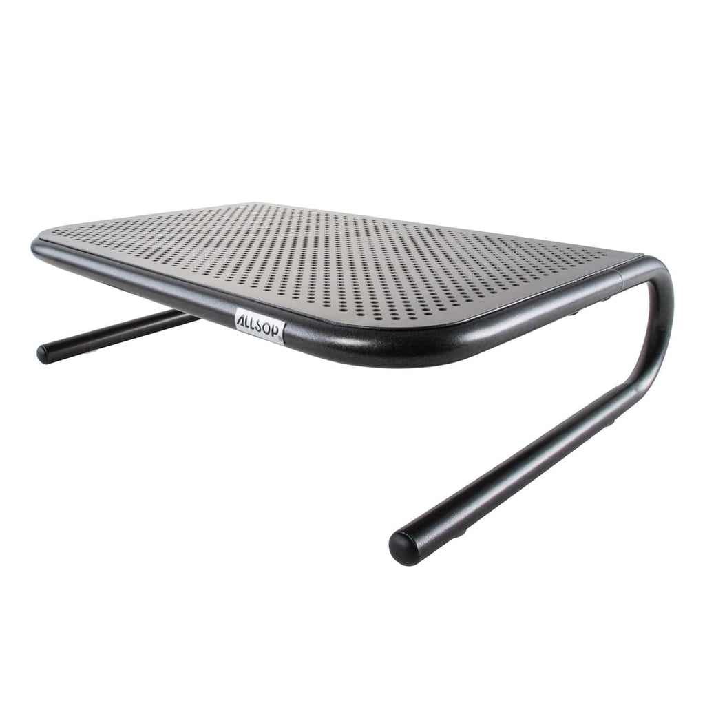 Raising your monitor or TV to a proper height is the key to achieving a comfortable and ergonomic viewing angle. The Allsop Metal Art Jr. Monitor Stand in Pearl Black can help you optimize your monitor or TV placement by raising it 4 in. off the surface. It features a unique design that organizes your workspace while providing valuable storage space underneath for your keyboard, laptop, or office supplies. The stand also has a vented platform surface for passive airflow to keep your devices cool.