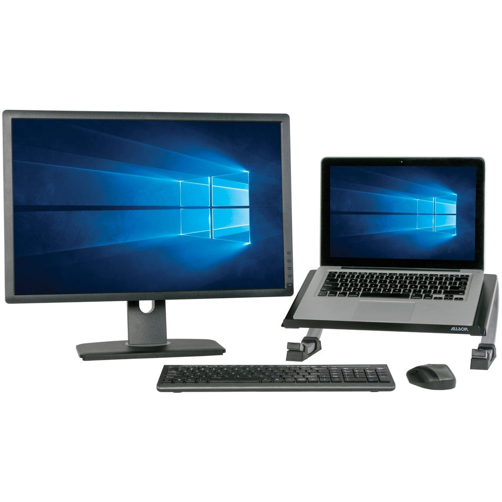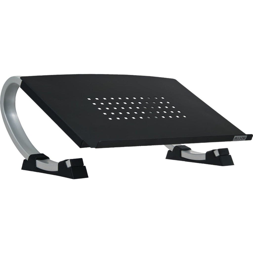 Allsop's Redmond Adjustable Curve Stand is designed to add ergonomic benefits as well as style when using your laptop at your workstation. The sliding black feet allows you raise or lower your laptop screen to put it at the correct angle per your height. Plug in your own keyboard and mouse to create the ideal desktop working atmosphere. It will keep you more upright and help prevent neck strain. The design includes a hi-tech style with a chrome-like base, a dark santoprene-coated shelf to keep your laptop secure and a central grate that helps dissipates heat away from your laptop.