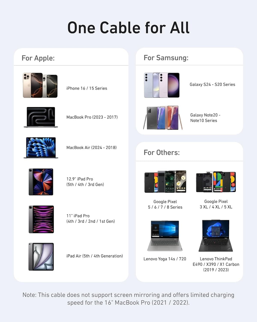 - Fast Charging: Supports a max power output of 100W when paired with a 100W or above wall charger to power up virtually any USB-C device, including phones, tablets, and laptops. (This cable does not support media display.)