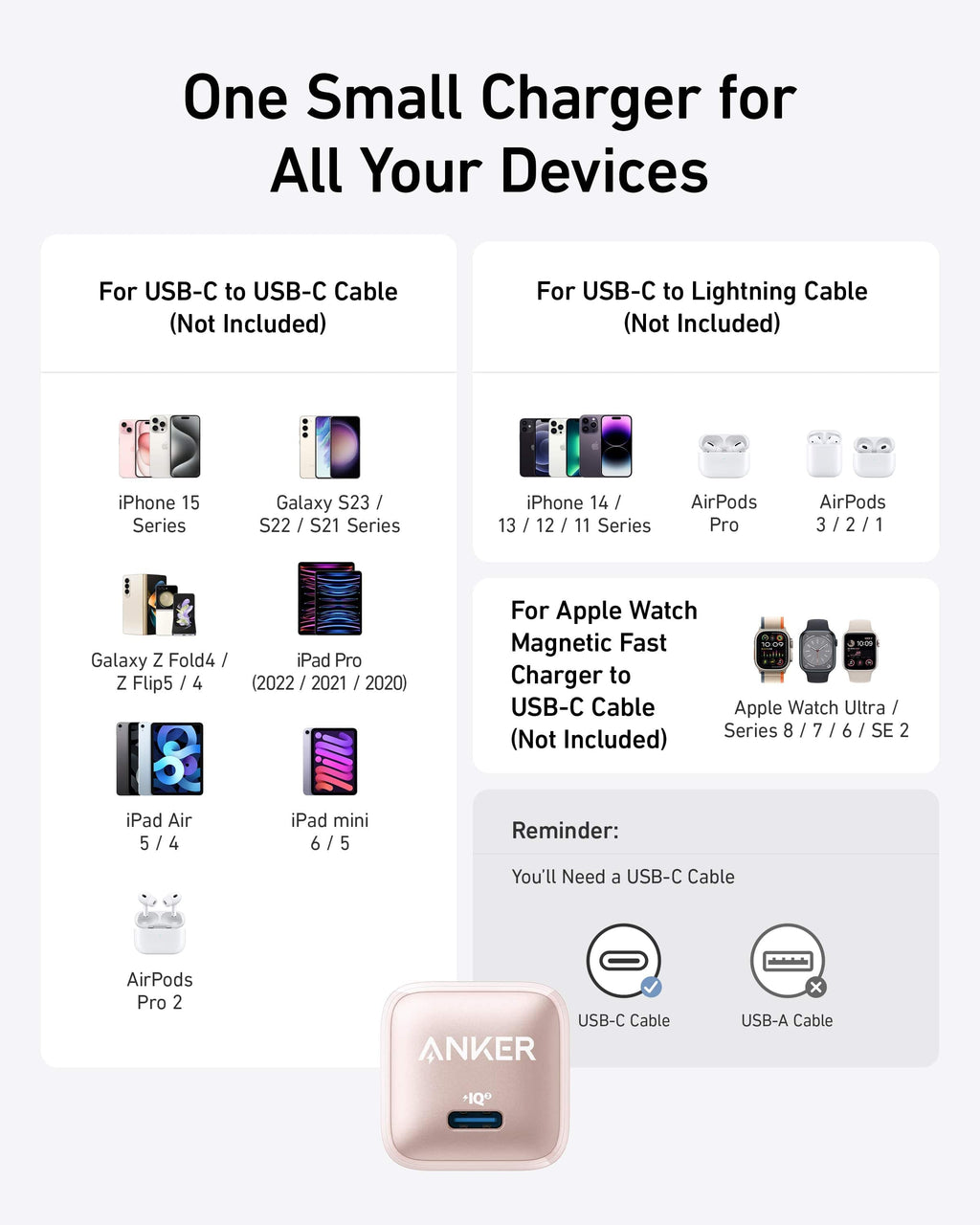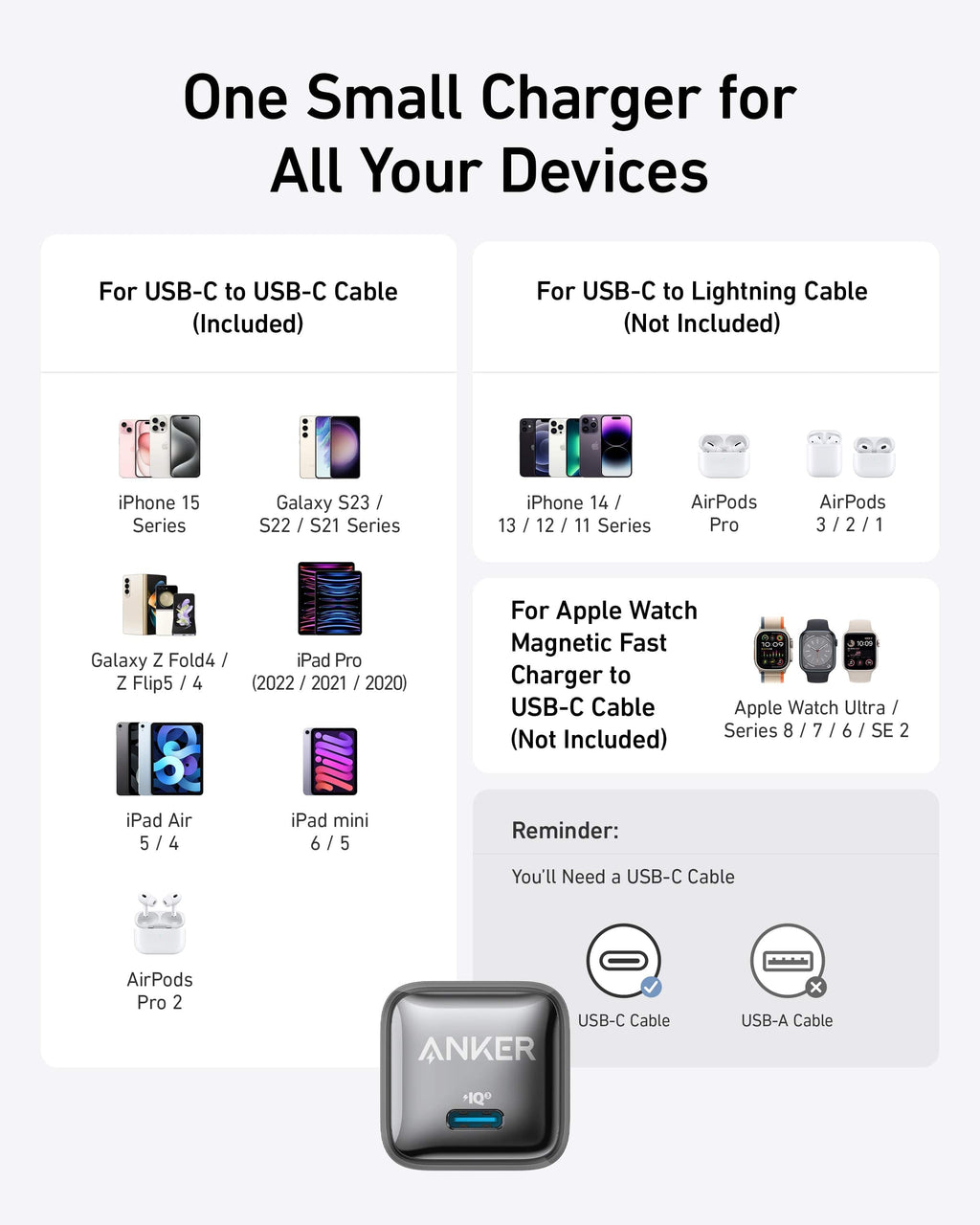 - What You Get: Anker Nano Charger (20W), welcome guide, our worry-free 18-month warranty, and friendly customer service (cable not included).