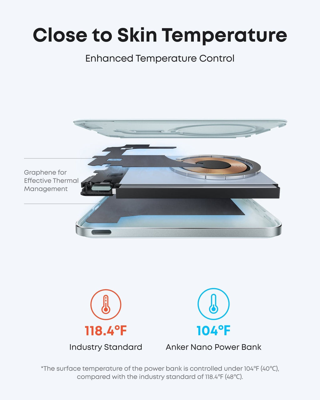 - 104℉ for Safer Handling: With the exceptional cooling benefits of graphene, dual NTC chips, and smart charging adjustments, this power bank stays below 104℉, 14 degrees cooler than the industry standard, for safer and more reliable charging performance.