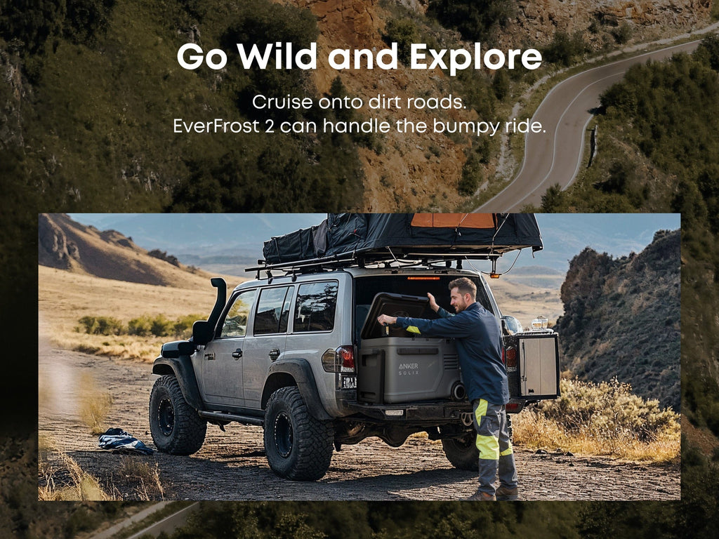 Everfrost Portable Powered Cooler 40L(42QT) with 288Wh built-in Battery. No ice is needed for cooling anymore! Anker EverFrost 2 Electric Cooler 40 can keep food and drinks cool for up to 2.2 days of uninterrupted chilling with a 288Wh LFP batteries and 4.3 days with two. It can cool down in 15mins only. Wheels and handles are designed and included by default for portable use. Plus, it can be recharged from solar,AC,Car,USB-C. Your perfect choice for outdoor camping and family road trips.