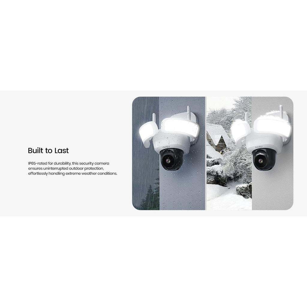 The hardwired Floodlight Cam Pro from aosu is your bright eyes for day and night. The 3K, 5.0-MP Wi-Fi camera features continuous 24/7 recording so you can experience full-color recording in any weather (IP65 rated), day or night. When detecting intruders in low-light or at night, the system will activate the intense, 2,600-lumen floodlights and sound a 105-dB siren while sending instant notifications via app. 3 PIR sensors detect movement beyond sight, automatically adjusting the lens for reliable tracking in a wide 270° range. Pan 360°, tilt 90°, and digitally zoom 6x via app for comprehensive surveillance coverage. Built-in AI identifies and tracks humans, vehicles, and pets, ensuring no blind spots. 2-way audio lets you chat effortlessly with visitors via app. It can also transform a female user’s voice into a male one for added privacy. The 2.4-GHz Wi-Fi camera supports up to a 128-GB microSD Card (not included) for on-board recording or you can set up an optional Cloud storage subscription plan.