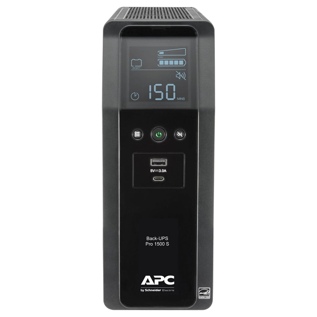 Protect computers, wireless routers, IOT devices, and security systems with the APC Back-UPS Pro 1,500-Volt Ampere 10-Outlet/2-USB Battery Back-Up and Surge Protector. This APC Back-UPS Pro provides premium backup battery power during power outages and continuously safeguards devices from fluctuating power conditions and surges. This sinewave UPS is designed for high-performance PCs, gaming consoles, and smart TVs and is active FC compatible. Automatic Voltage Regulation instantly corrects high/low voltage fluctuations so connected devices receive consistent power. With 10 outlets and 2 USB charging ports, this desktop UPS provides seamless battery power to connected electronics. The 900 watt capacity is ideal for workstations and additional electronics, keeping you connected and productive during power fluctuations. Connect and charge mobile devices via the 2 USB (USB-A and USB-C) ports. The USB ports will provide power when the UPS is both on utility and battery power. The included PowerChute software is available to set up automatic graceful shutdown of a connected PC in the event of an extended power outage. The angled LCD display provides details concerning power-load of connected devices, battery runtime based on connected devices, the power level of the battery and more. 2 RJ45 data ports are in the back to protect DSL, modem, or fax lines from potentially harmful power surges. 2 coaxial ports are also in the back of the UPS for additional protection.
