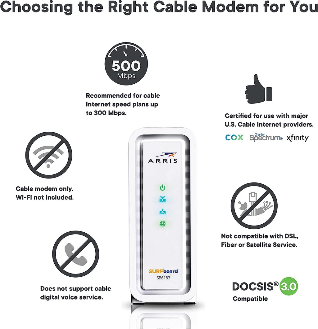 The ARRIS SURFboard SB6183 is a DOCSIS 3.0 cable modem with 16 downstream and 4 upstream bonded channels to deliver a powerful high-speed internet experience. The SB6183 is best for internet speed plans up to 400 Mbps. Stop spending money renting your modem. Own yours today! With DOCSIS® speeds up to 686 Mbps, the SB6183 offers you more speed, more network capability, faster streaming and downloading throughout your home.