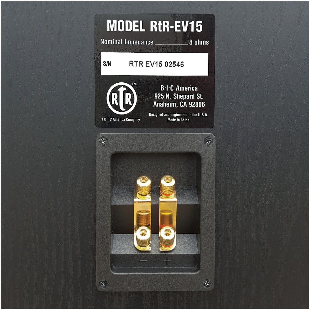 The BIC America RtR Eviction Series RtR-EV15 has a heavy-duty 15-in. woofer as well as a magnet that is twice the size of the BIC RtR-1530 magnet! It also incorporates a sealed 5-1/4-in. midrange and mid-high frequency horn tweeter that enables extended output to 116 dB. The outstanding power-handling capability of the RtR-EV15 can accept the output of powerful amplifiers without a whimper and look great while doing so! This floor-standing speaker is also bi-ampable. There are some occasions when it is advantageous to drive the woofer separately from the mid-range and tweeter. This process (bi-amplification) is enabled by 2 sets of gold-plated input terminals—1 set connected to the woofer circuit and the other to the crossover circuit for the mid speaker and the horn tweeter. Gold-plated removable straps connect the two sets of inputs for conventional single-amplifier operation.