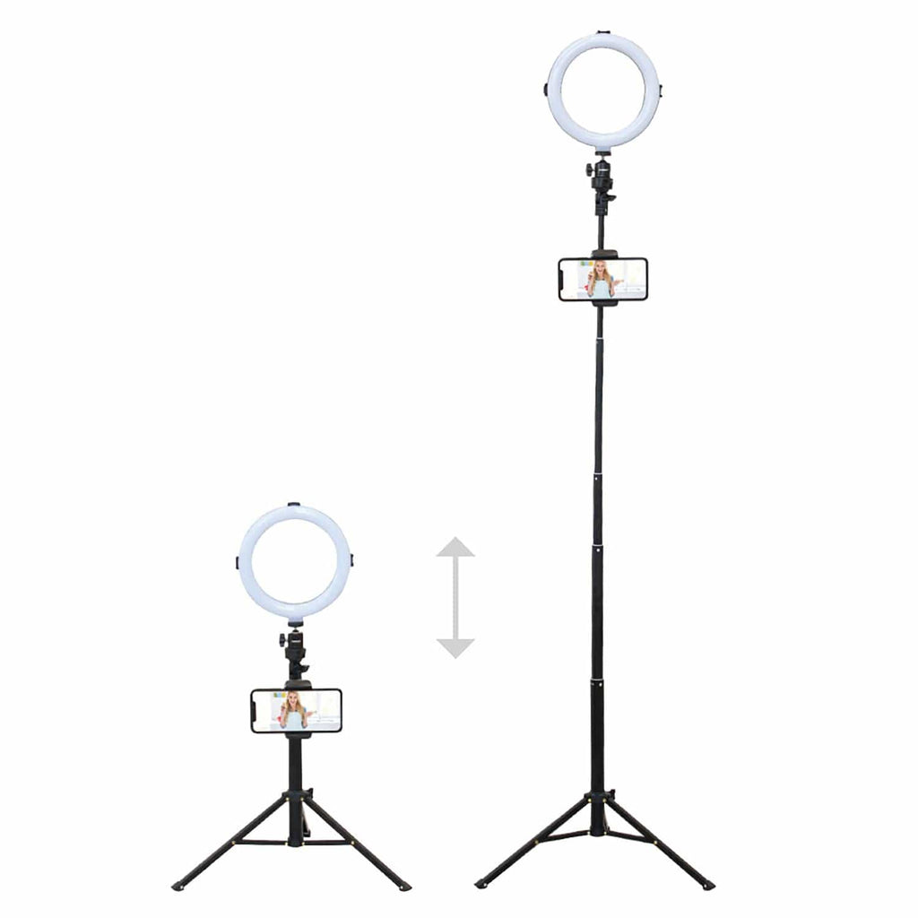 - Includes an 8-in. ring light, extendable tripod, phone holder with pivot mount, wireless remote shutter, and a smartphone clip adapter