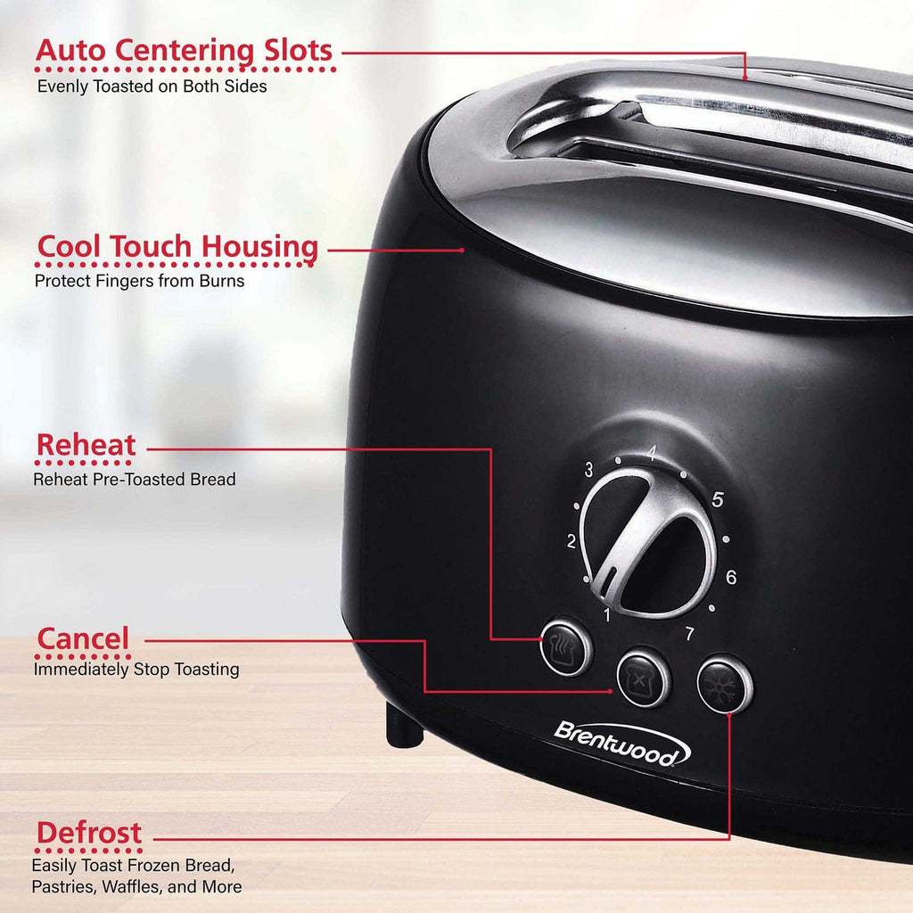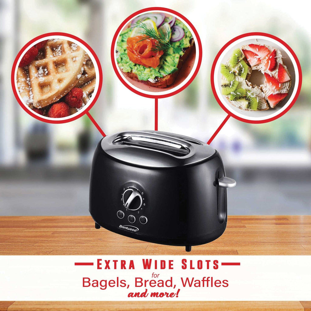 The powerful Brentwood TS-270BK Cool Touch 2 Slice Retro Toaster with Extra Wide Slots can toast bagels, thick artisan bread, waffles, and more. Choose between 7 shades, light to dark. The efficient auto centering guides insure even toasting. The Black toaster includes easy access crumb tray and convenient cord wrap.