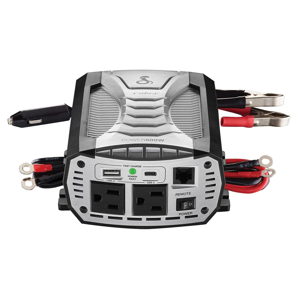 Harness the power of your vehicle's DC battery! Add the convenience of home appliances on your next road trip or even turn your car into a mobile office. The Cobra POWER 500-Watt Power Inverter turns your car battery into usable A/C household current. It is ideal for cross-country travelers, campers, RV enthusiasts who want to charge and power their smartphones, laptops, entertainment devices, and small appliances—or for when a power outage occurs. Count on Cobra for power where you need it.