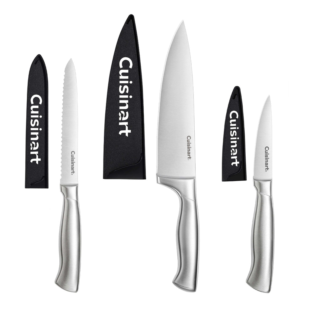 3pc Chef Set Includes: 8" Chef Knife w/guard 5.5" Serrated Utility Knife w/guard 3.5" Paring Knife w/guard Stainless Steel Collection