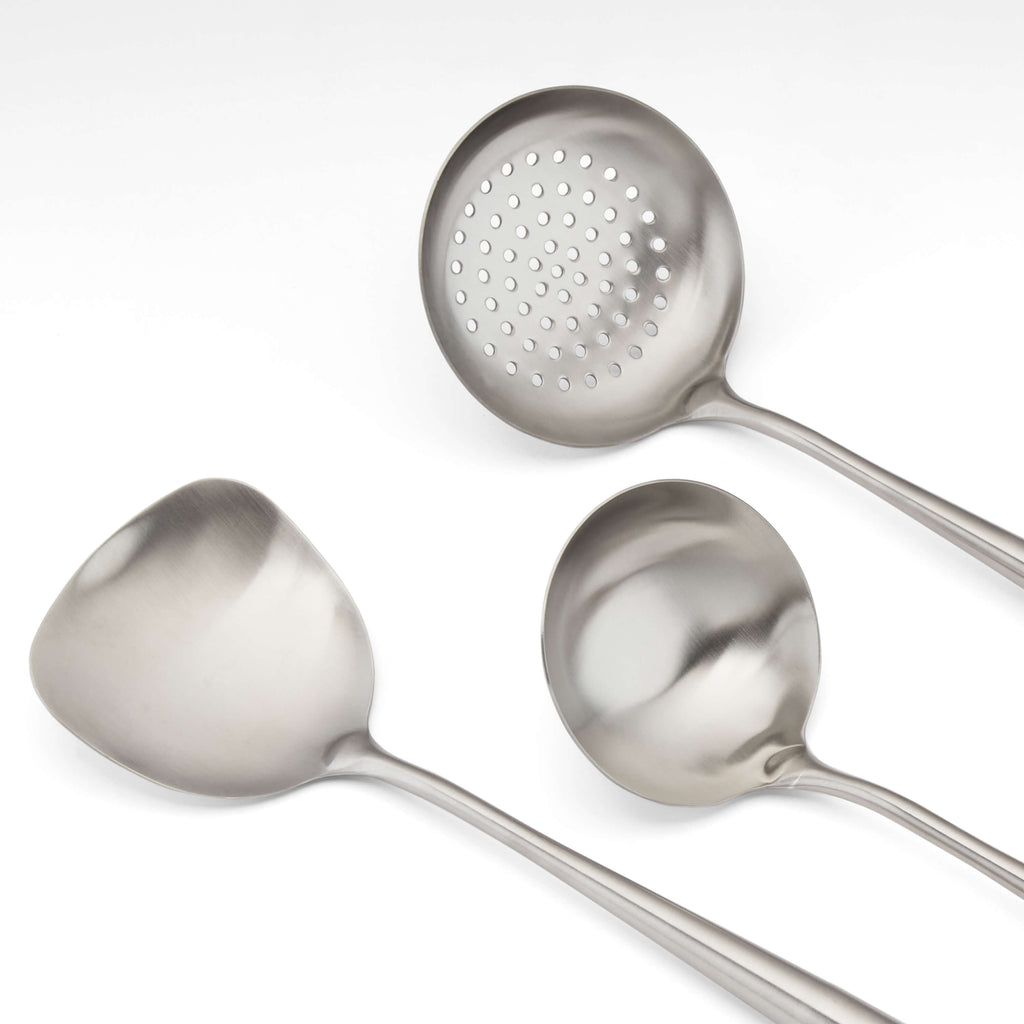 Stir fry and sauté delicious hot meals using the trio of essential utensils made specially for wok cooking. The stainless steel turner, skimmer, and ladle have handles topped with smooth acacia wood for a solid hold, so mixing meals is quick, safe, and controlled with ease. Contoured tool heads are made to move food around the curved walls of the wok, while the extra-long handles keep hands and arms at a safe distance from hot splatter. The sleek wood and metal design complements the modern kitchen. Crafted with a hole on the end of each handle for easy hanging, these premium tools are perfect for displaying between uses.
