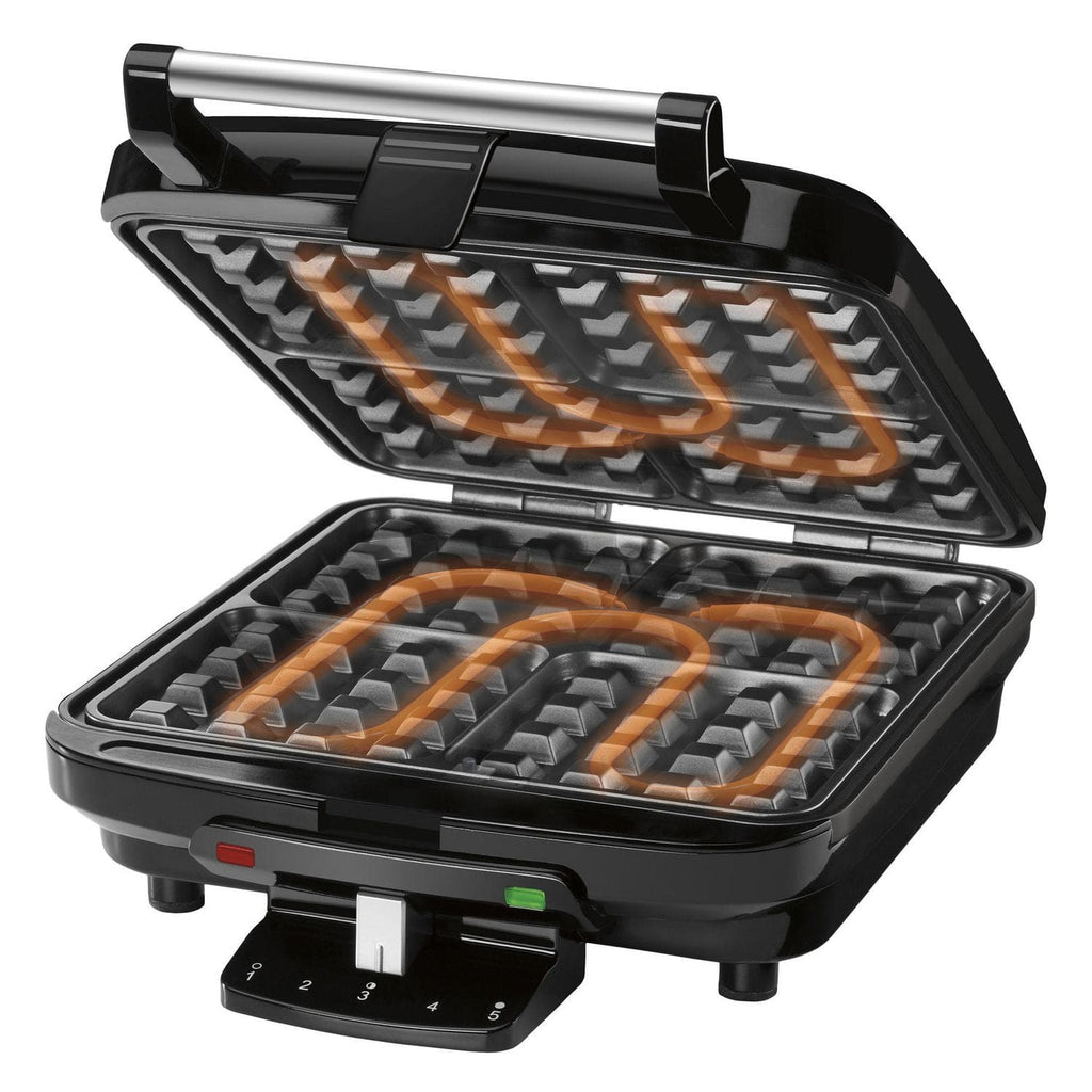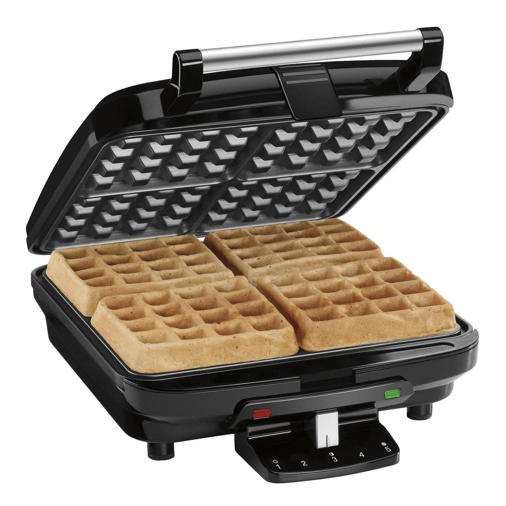 Exceptional Design 4-Slice waffle maker bakes 1-inch deep belgian waffles. Five-setting browning controls– Green indicator light illuminates when the waffle maker is ready to bake, red power light stays on while baking, green indicator turns back on when waffles are done High Performance waffle iron has a locking lid, nonstick baking plates,chrome-plated handle. Cord wraps under the base and unit stands on end for compact storage– instruction/recipe book included Clean Up refer to manual for specific cleaning, care and maintenance of waffle iron