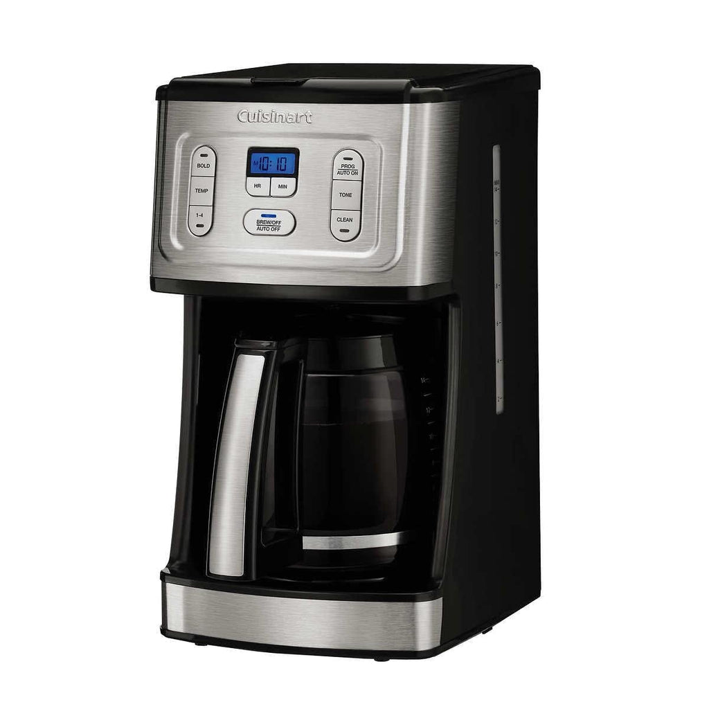 The Cuisinart Brew Central 14-Cup Programmable Coffee Maker is engineered to produce the perfect brew. Cup after cup, this Coffee Maker combines extra-large capacity with fully programmable convenience. Designed with an array of custom settings, from 24-hour Brew Start to adjustable Auto-Off, it brews up to 14 cups into a dripless glass carafe. Choose regular or bold flavor and high, medium or low carafe plate temperature. Using our cutting-edge coffee technology, the 14 Cup Programmable Coffee Maker can give you hotter coffee without sacrificing taste. The backlit LCD is easy-to-read, a ready tone can be turned on or off, and an indicator light signals when it s time to decalcify. Enjoy the freshest, most satisfying coffee, with a charcoal filter that eliminates water impurities, and a gold-tone filter for superior flavor.