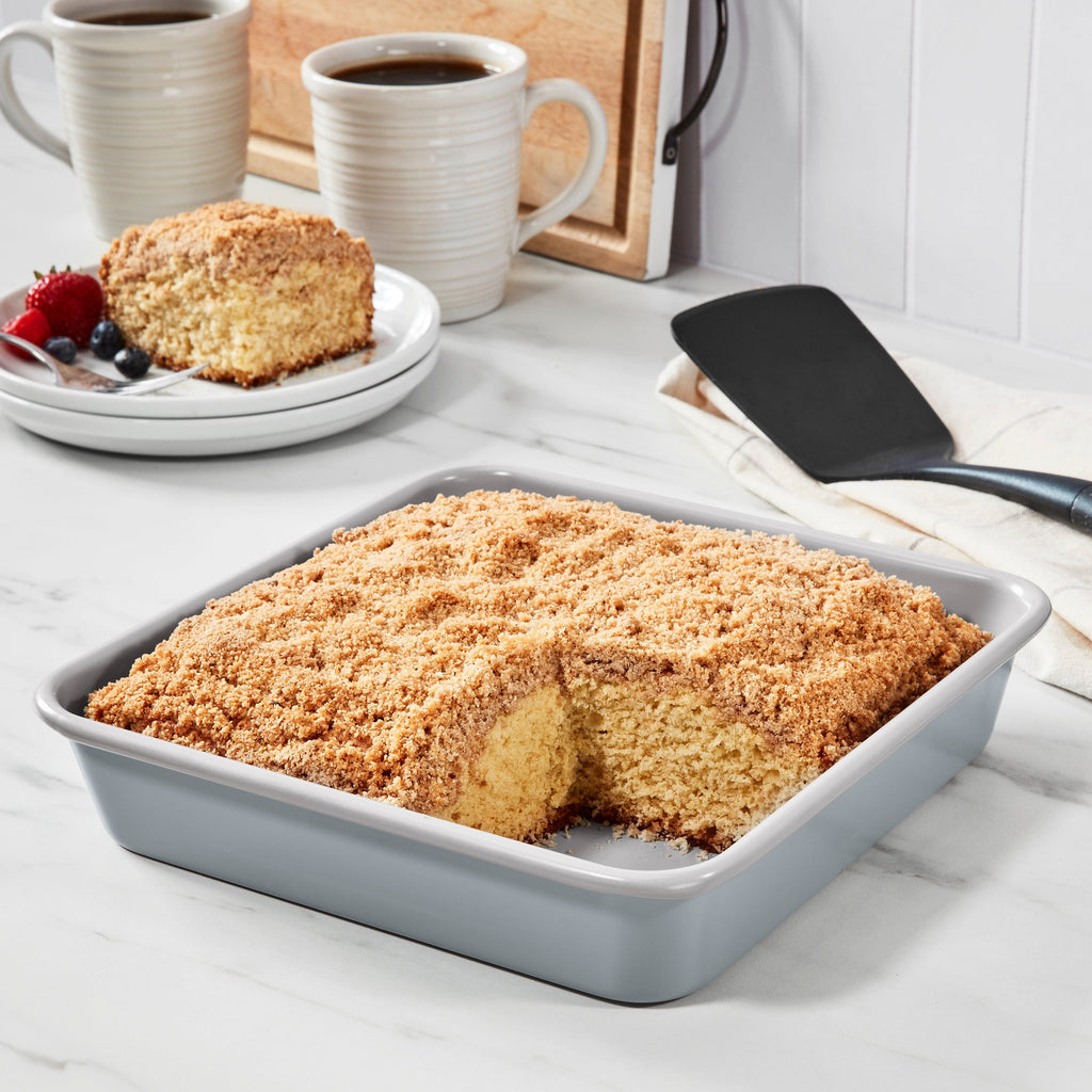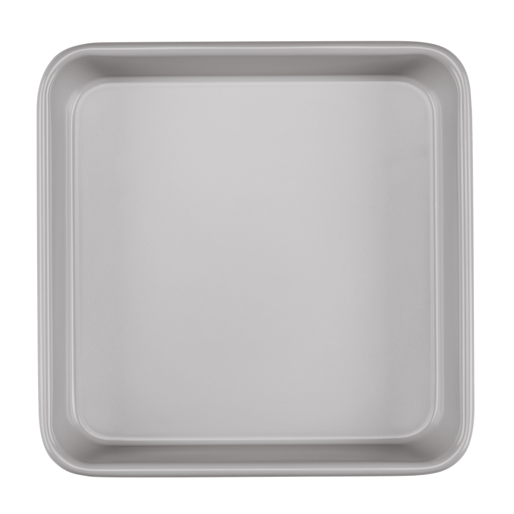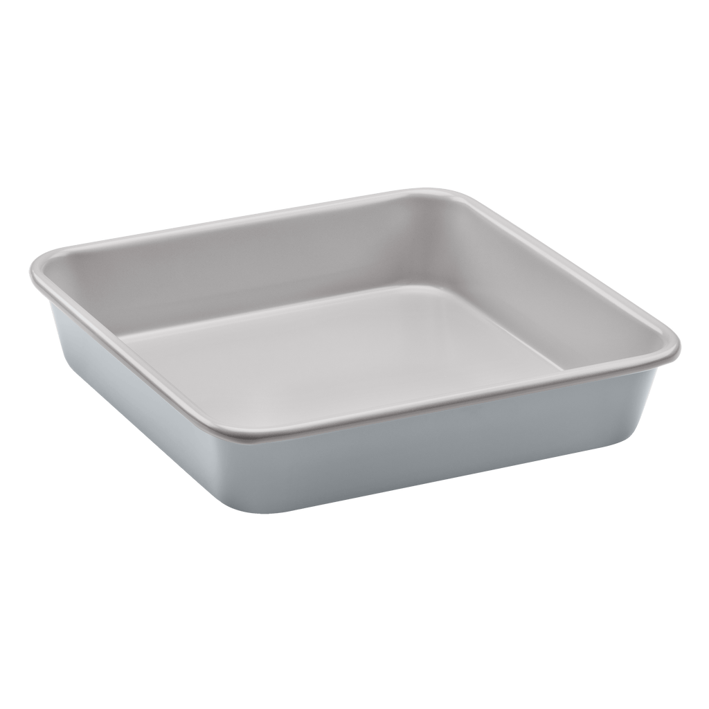 This 9" Square cake pan features a heavy gauge carbon steel construction, a ceramic interior with a nonstick color exterior, thick rolled edges, and is dishwasher safe.