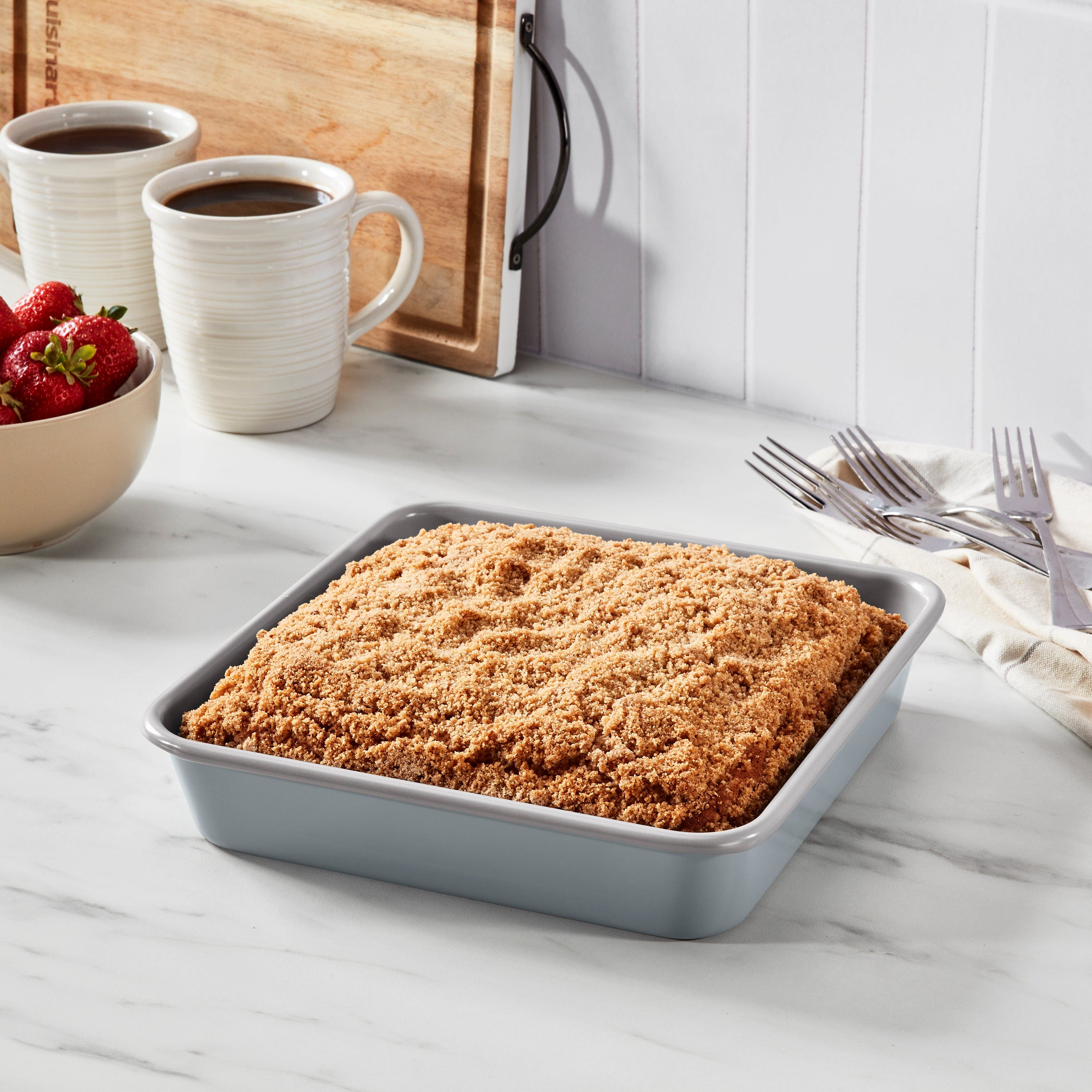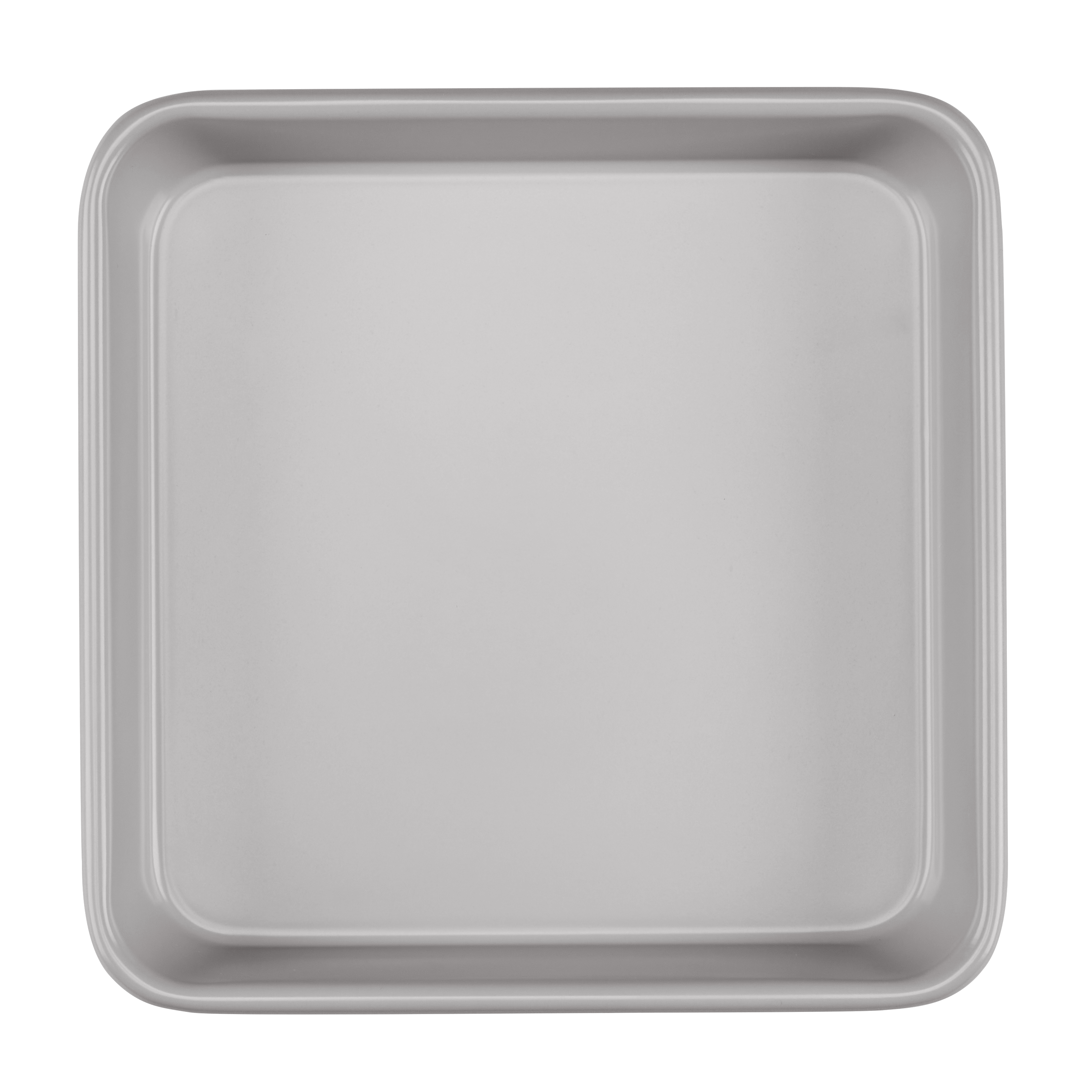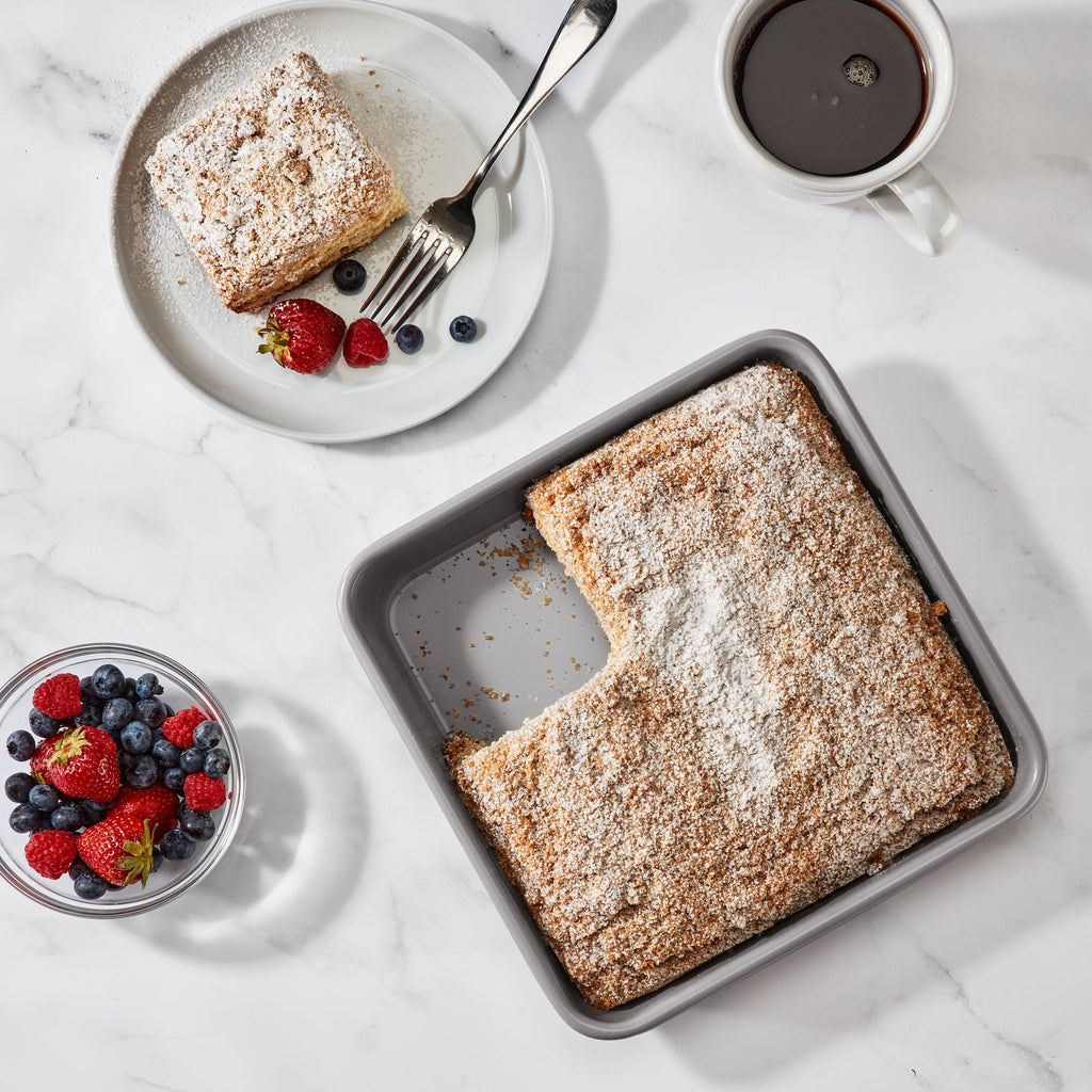 This 9" Square cake pan features a heavy gauge carbon steel construction, a ceramic interior with a nonstick color exterior, thick rolled edges, and is dishwasher safe.