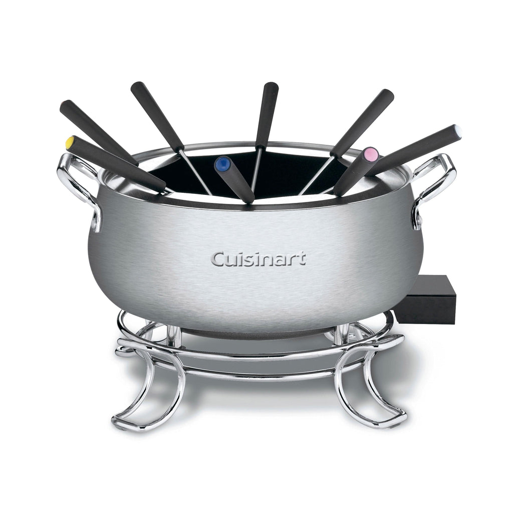 Cuisinart® Electric Fondue Set Now fondue is easier than ever. The stick-free Cuisinart® Electric Fondue Set has a heating element built into the base of the pot and a thermostat that adjusts to a wide range of temperature settings. Consumers can prepare chocolate, cheese, broth or oil fondues in this elegant 3-quart brushed stainless pot. As always, Cuisinart® makes cleanup easy. The nonstick pot offers superb food release, and the entire unit is dishwasher safe.