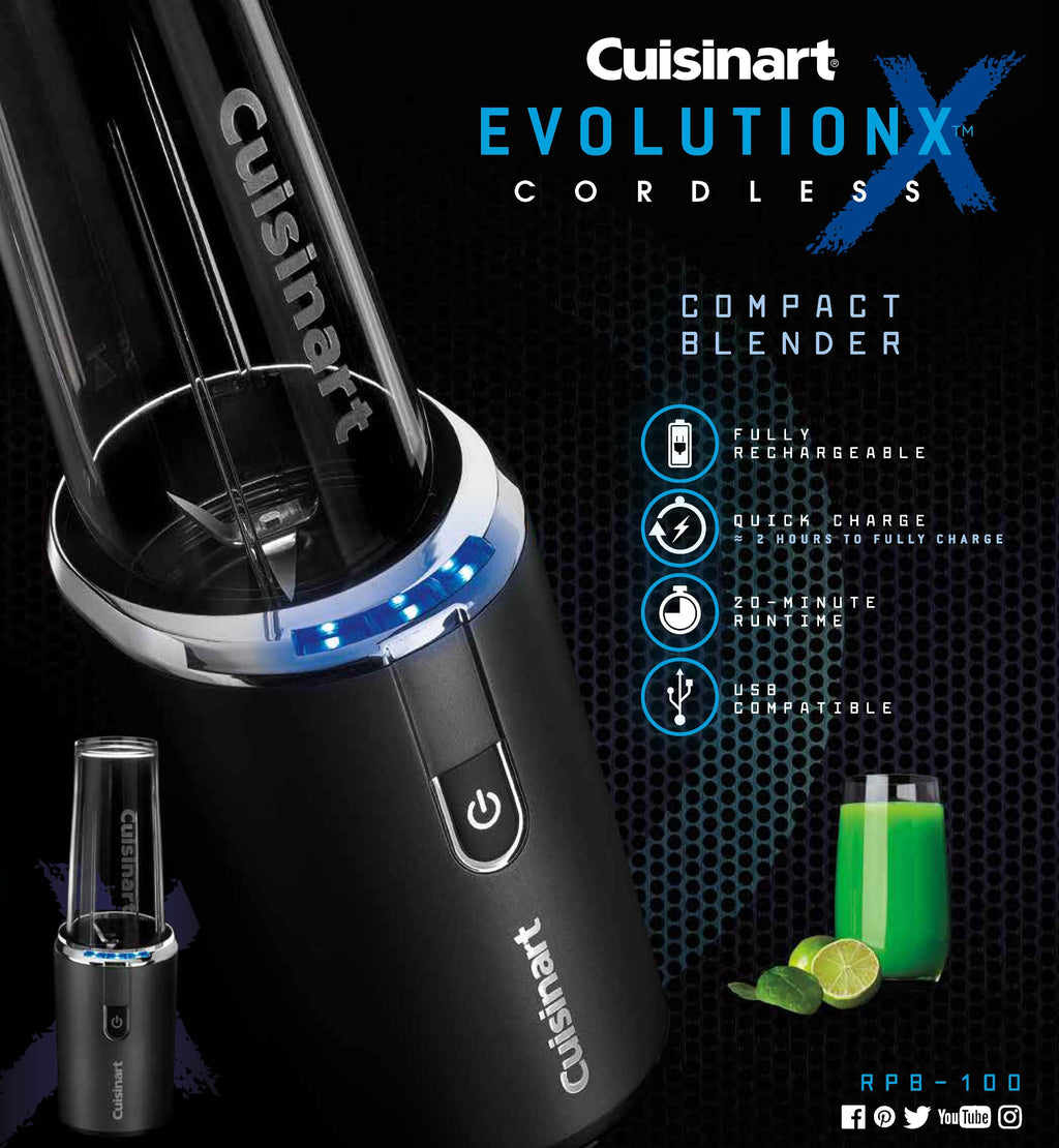 Compact, cordless convenience meets full-size professional performance. Powered by 7.4 volts of lithium ion efficiency and easily rechargeable with a USB cord, the EvolutionX Cordless Rechargeable Personal Blender does it all, from blending smoothies and shakes to crushing ice and pureeing soups. Portable. Powerful. Perfect for use at home or on the go!