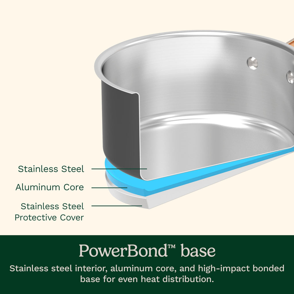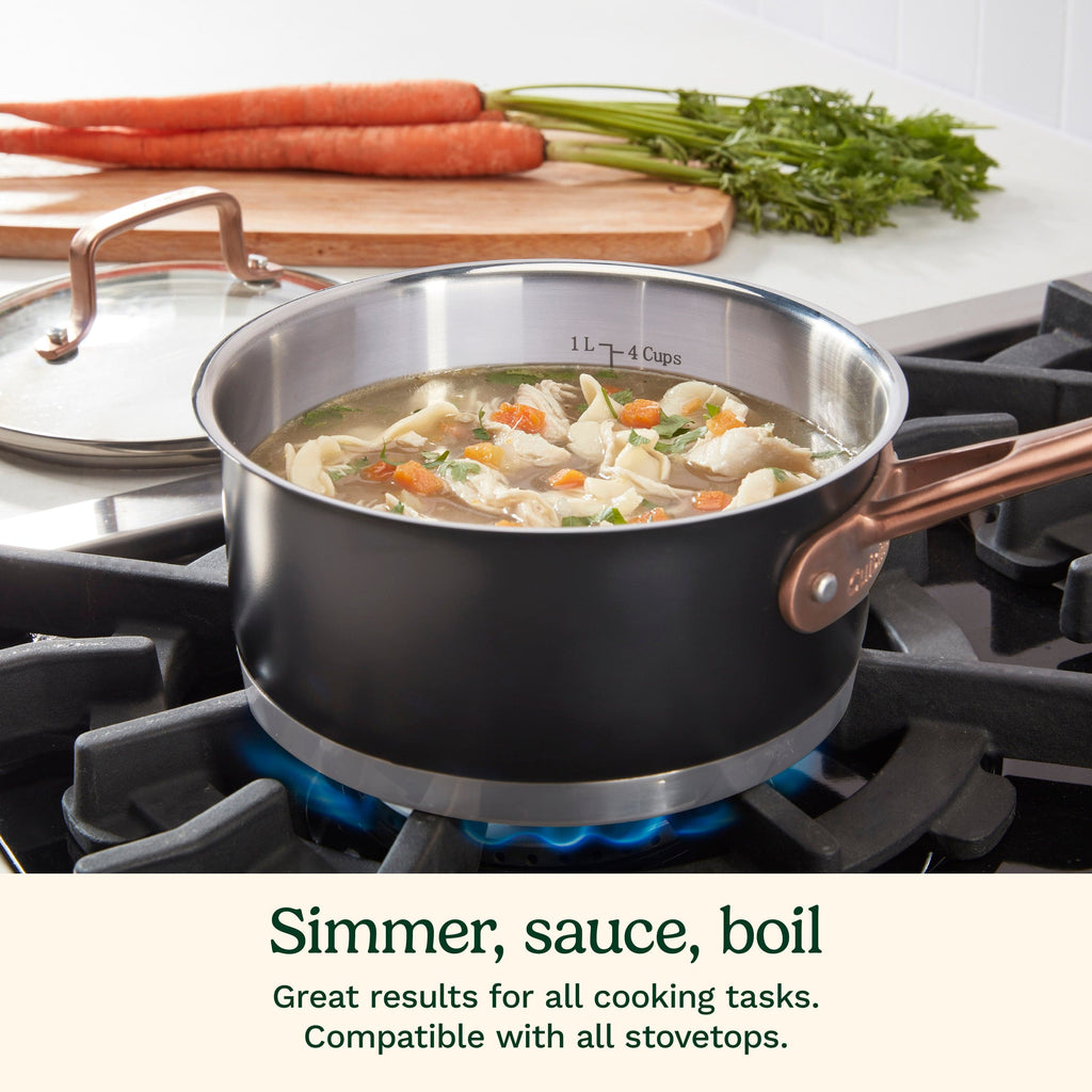 This 1.5 Qt. saucepan features an elegant matte black finish and professional stainless steel construction with a matte black exterior. Its PowerBond™ high-impact bonded base ensures even heat distribution, allowing you to simmer, sauce, and braise with professional results, while the riveted stainless steel blush bronze stick handles stay cool on the stovetop. Additionally, the magnetic stainless steel bodies are compatible with all stovetops, including induction, and the cookware is dishwasher safe for easy cleaning.