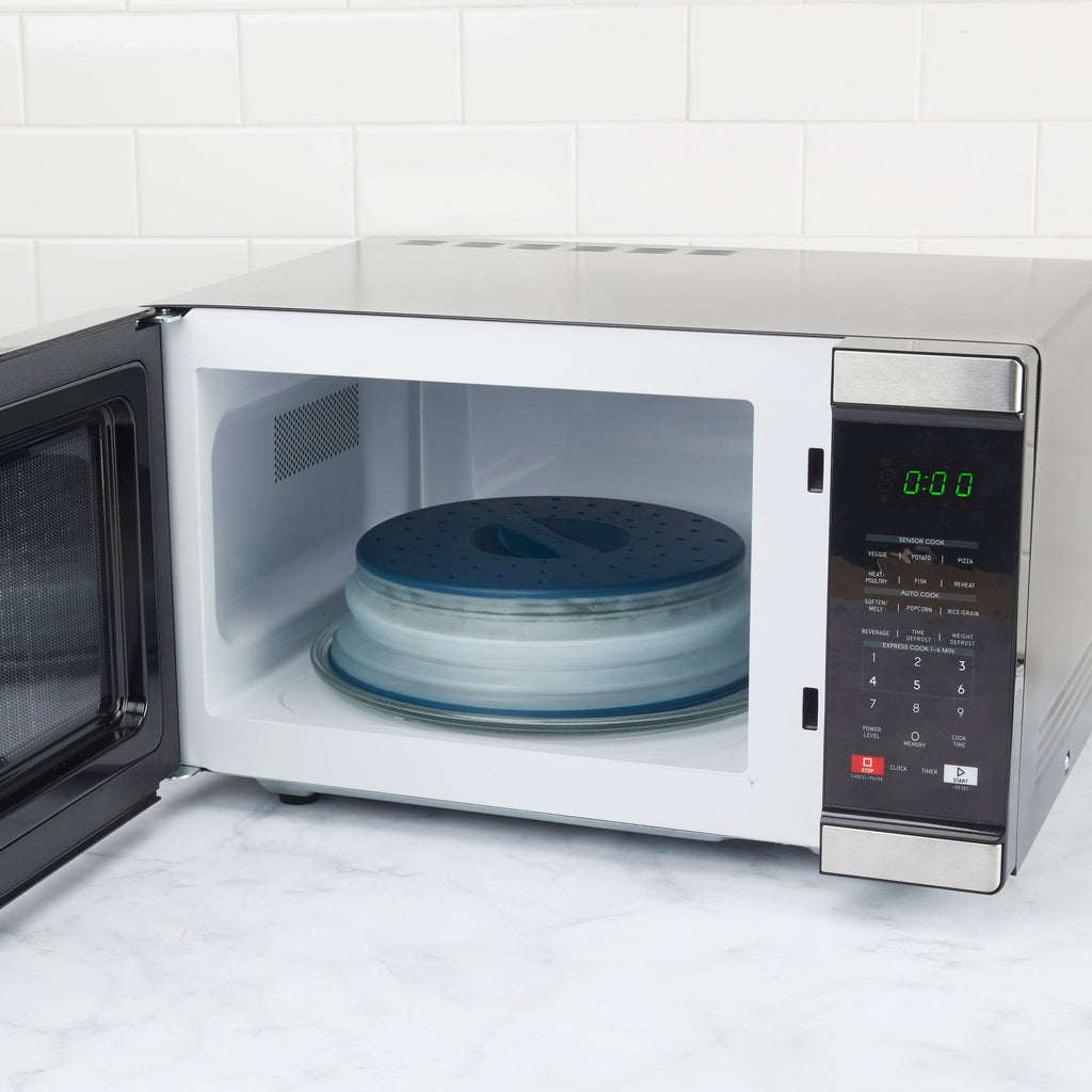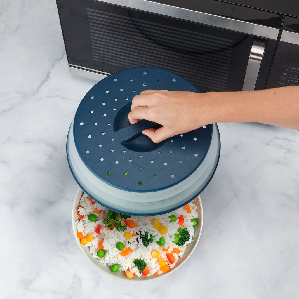 Keep messes to a minimum with the handy Microwave Food Cover by Cuisinart®. The cover is vented to release steam while it contains splatter, so foods cook to perfection and your microwave stays spotless. Cover dishes and bowls up to 10” in diameter, then lift the lid safely with the stay-cool handle. After fast and easy cleanup in the dishwasher, collapse the cover for compact, space-saving storage.