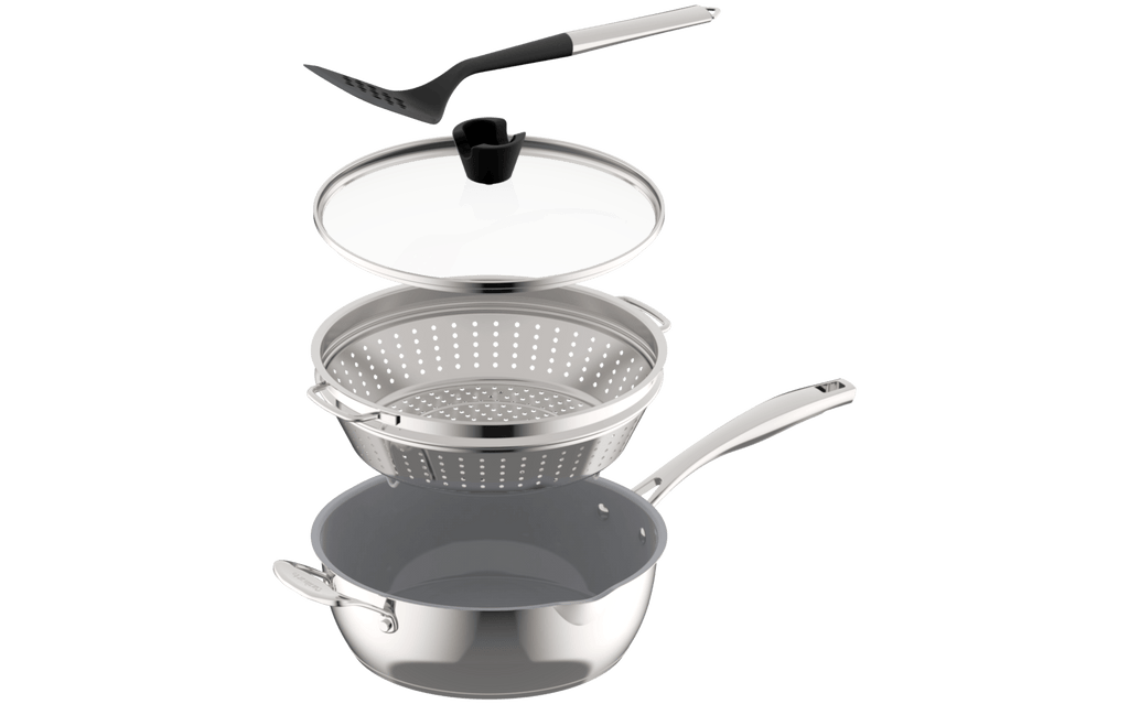 - The pan that does it all! Performs at least 14 cooking tasks - poach, steam, strain, sauté, sear, fry, boil, simmer, sauce, braise, deglaze, brown, bake, roast