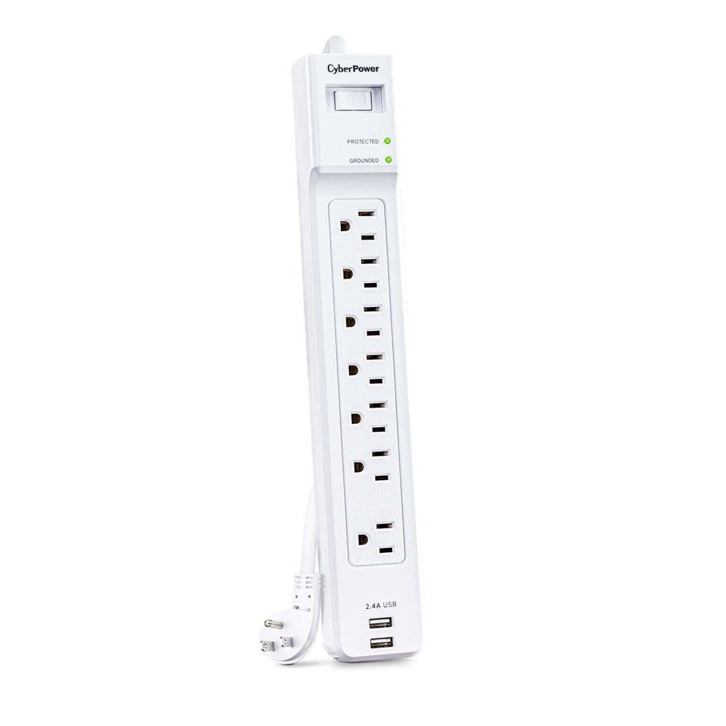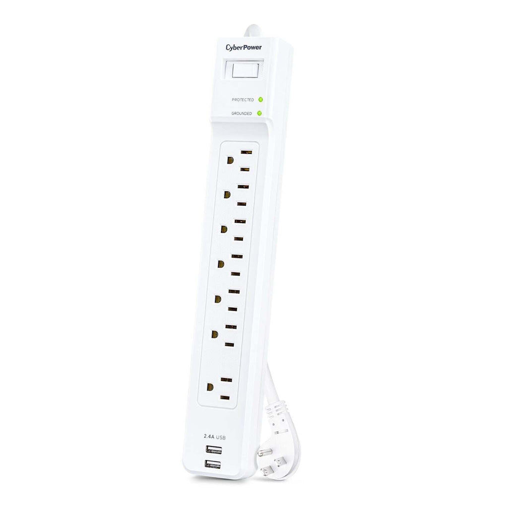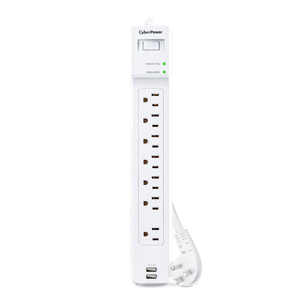 The CyberPower P704URC1 7 outlet surge protector offers a high level of surge protection for common home and office electronics such as computers and peripherals, home theater equipment, and appliances. With 2000 joules of surge protection, the P704URC1 prevents power surges and power spikes caused by storms and electrical grid fluctuations from reaching and potentially harming your valuable electronic equipment. In addition to surge protection, the P704URC1 has 2 USB-A ports rated at 2.4 amps of shared output, which will charge USB enabled mobile device. The P704URC1 comes with 7 standard, grounded power outlets and a 4 foot power cord with a low profile grounded plug, which fits tightly against walls for placement behind furniture.