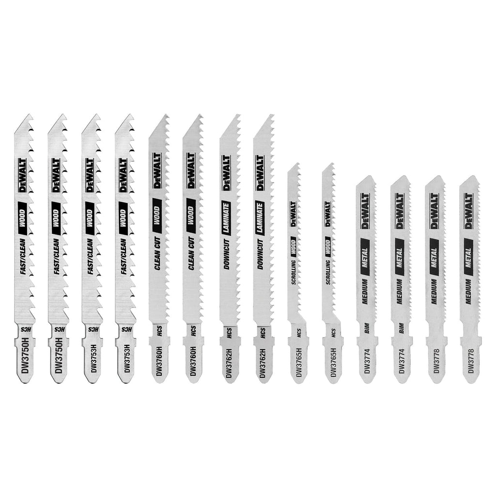 Be ready for a wide range of cutting applications with the DEWALT 14-Piece T-Shank Jig Saw Blade Set. Packed with 14 metal and wood-cutting blades, the set comes with a durable, clear 2-sided case to keep blades neatly together. They are ideal for fast wood cutting, clean wood cutting, down cutting for laminate, and metal cutting. The T-shank design fits all Bosch and DEWALT jig saws.