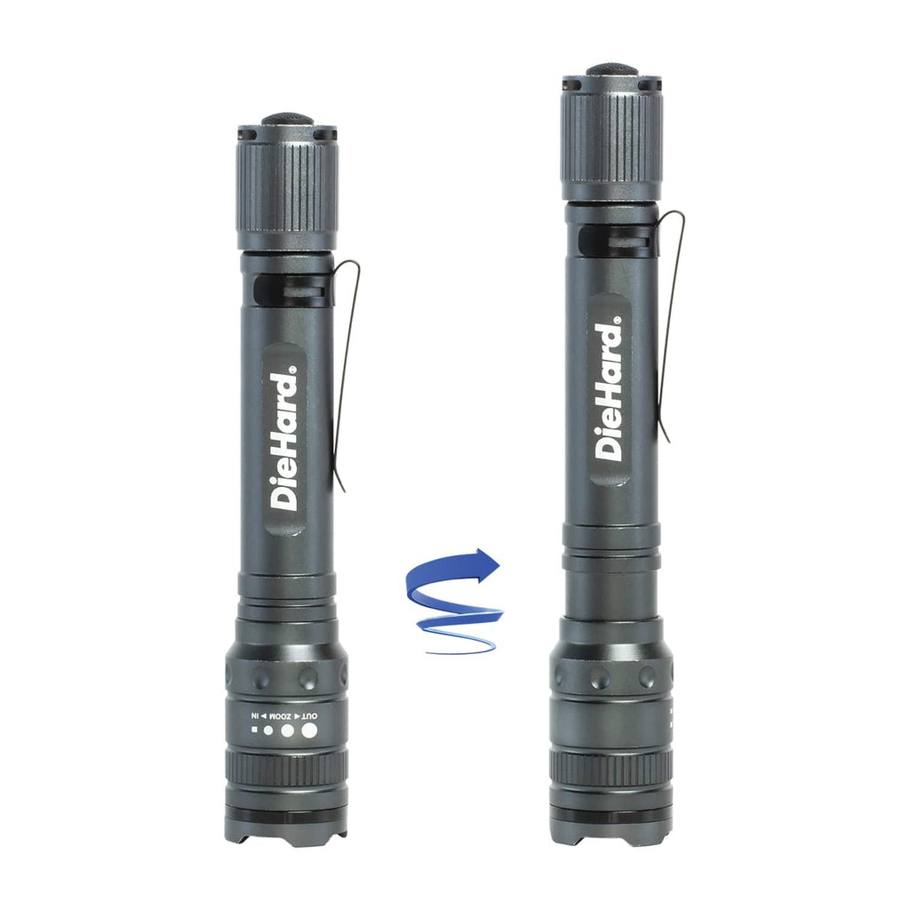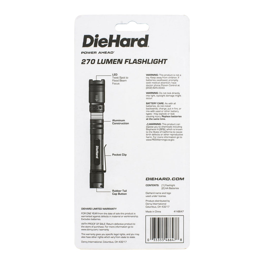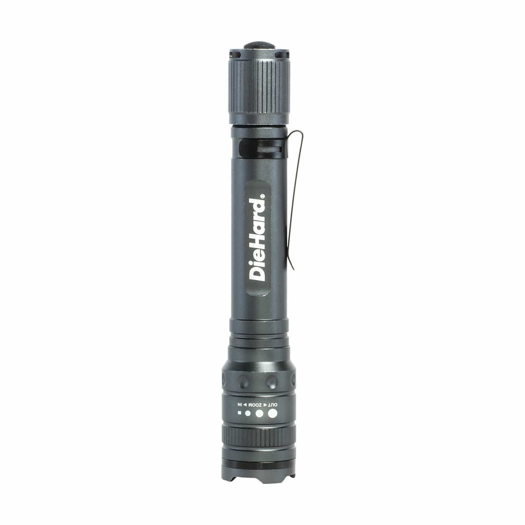 This DieHard 270-Lumen Flashlight is made with pro-grade, durable anodized aluminum construction and has a premium fit and finish. It features a precision spot-to-flood twist-focus system, which allows you to adjust the beam width to suit your needs. The heavy-duty, true-grip design provides a comfortable and secure hold while the pocket clip allows you to easily carry the light with you. The flashlight is impact- and water-resistant, and the rubber-booted tail-cap switches make it easy to use in any condition. It has a switch sequence of high/low/strobe/off and a run time of up to 3 hours and 15 minutes on high and 6 hours on low. The beam has a range of up to 328 ft. (100 m). This rugged flashlight uses 2 AA alkaline batteries, which are included.