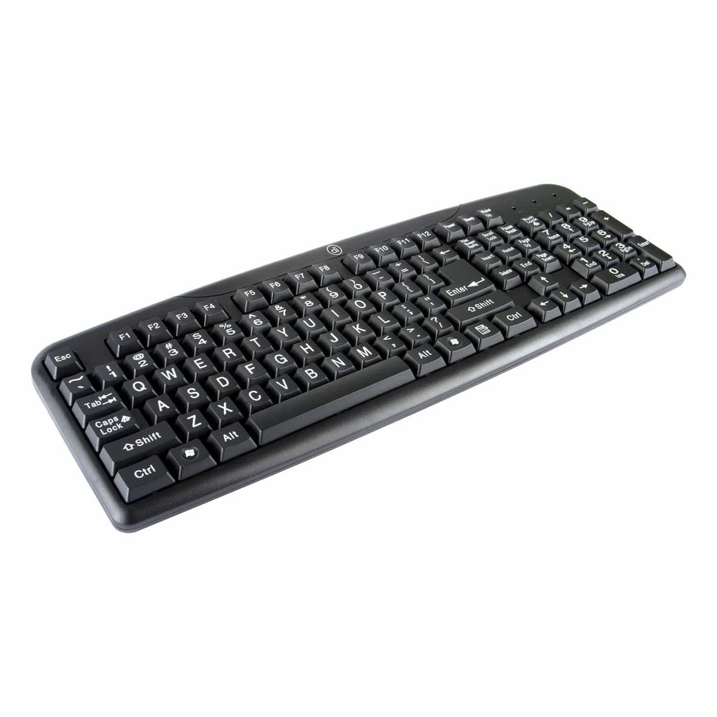 The Digital Innovations Easy-View USB Keyboard is comfortable, adjustable and easy to read. 107 large print keys prevent eye strain and compact keyboard dimensions so it fits in most sliding trays. A spill-resistant design provides protection by allowing spilled liquids to drain out of the keyboard, and an adjustable keyboard height offers personalized comfort. The attractive styling complements any computer.