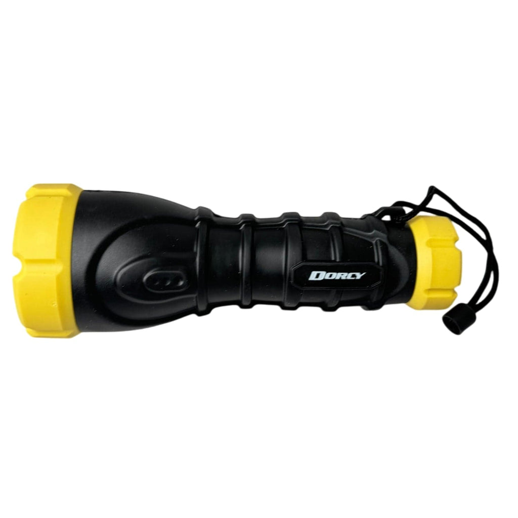 Discover the resilience of the Dorcy 250-Lumen LED Rubber Flashlight, crafted from durable weatherproof TPE rubber for extended longevity. Illuminate your surroundings with a beam distance exceeding 885 ft. (270 m), powered by a mere 3 AA batteries for up to 7 hours. Its sleek yet sturdy design ensures comfortable handling, complemented by a nonslip grip, exceptional weather resistance, and a sealed push-button switch that guarantees effortless operation. Presented in a striking black hue with vibrant yellow accents, this flashlight also comes complete with a handy nylon lanyard and 3 AA alkaline batteries for your convenience. Elevate your lighting experience with the 250-Lumen LED Rubber Flashlight.