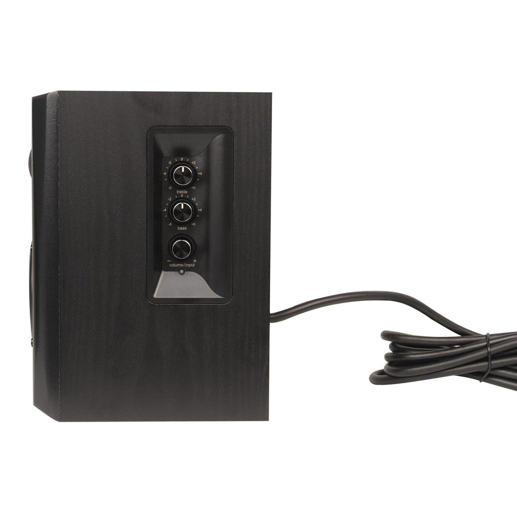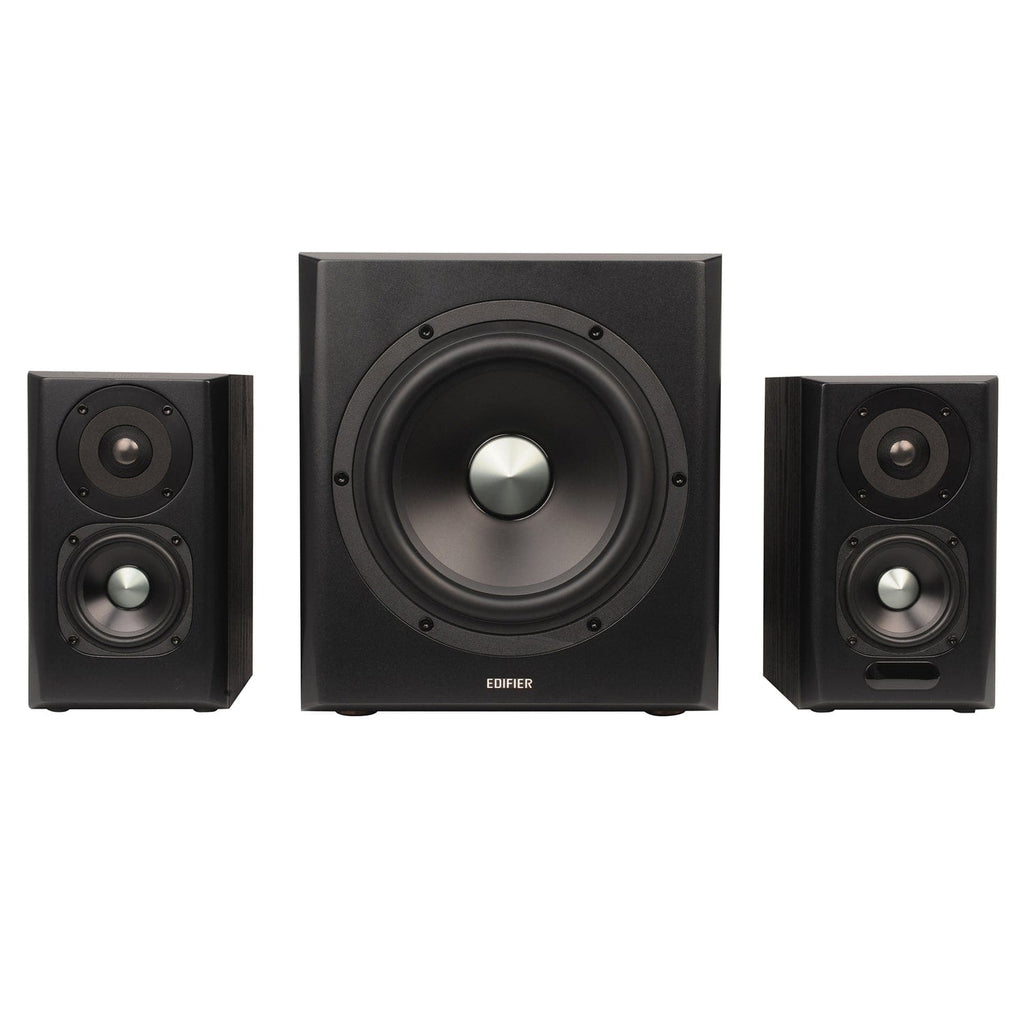 The Edifier S351DB 2.1 Multimedia Bookshelf Speaker System offers old-school style with modern sound. Enrich your audio with crisp, clear highs provided courtesy of our high-quality titanium dome tweeters. Deep, rich lows are a highlight of this 8-in. bass subwoofer unit so your get sound that really shakes things up. Take full control of your audio with the side panel controls on the side of the active bookshelf speaker. 3 knobs are located on the side that affect the bass, treble, and volume for the entire 2.1 system.