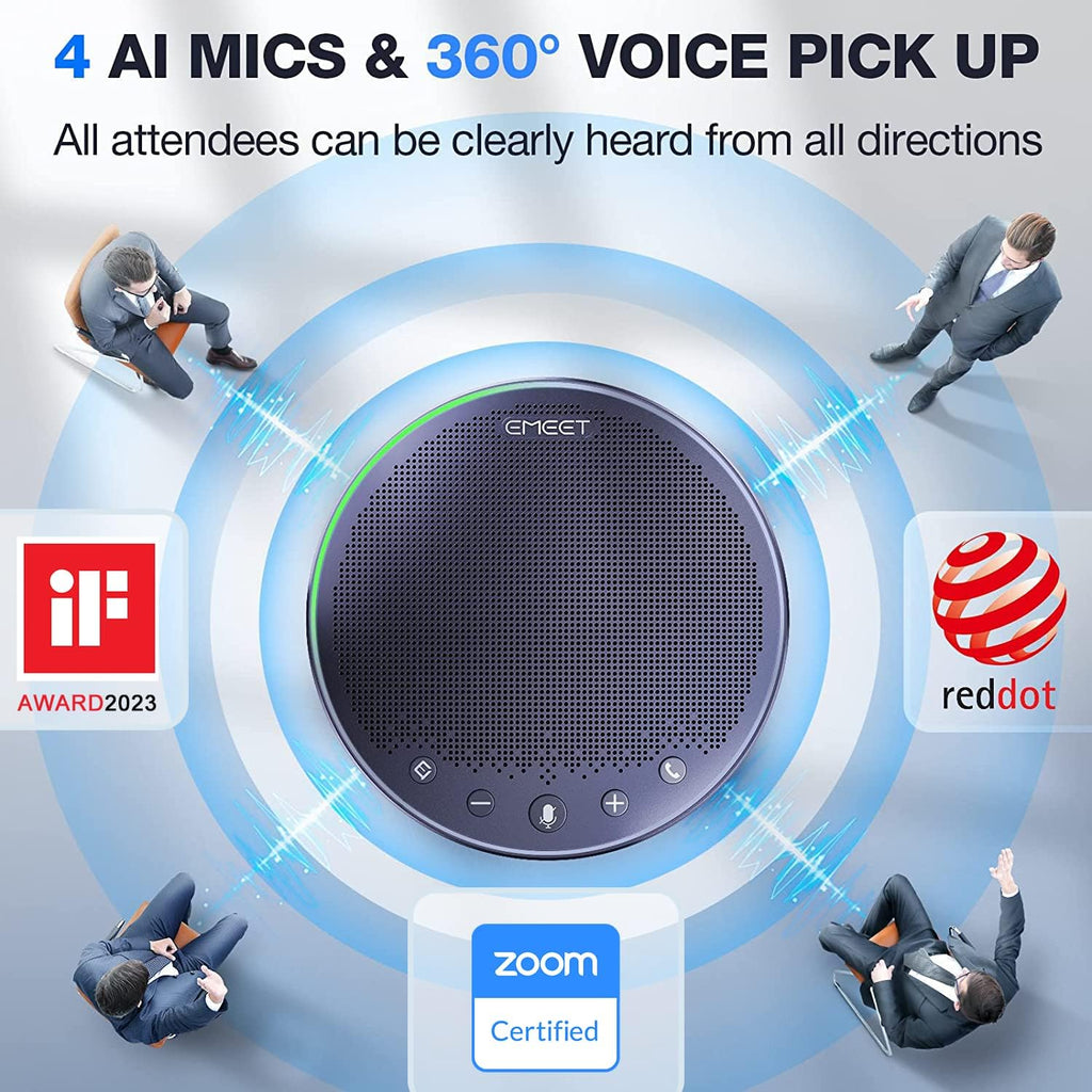 - 360° Voice Pickup, Be Heard Anywhere in the Room - With 4 omnidirectional microphones the speakerphone provides clear and natural 360° voice pick up within a distance of 16.4'. The smart audio algorithm detects the active talker's position, and the ring light illuminates on the corresponding side, denoting the incoming human-voice direction accurately.