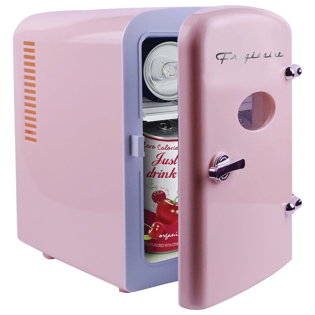 The Frigidaire 0.5-Cu. Ft. Retro Portable Mini Fridge is a cool and fun way to keep your favorite beverages and snacks cold. The retro design will look great with any decor whether contemporary or traditional. It is ideal for a dorm room, office, or RV and even for keeping makeup fresh. Take it with you while driving, since the fridge plugs in to 12-volt car adapter.