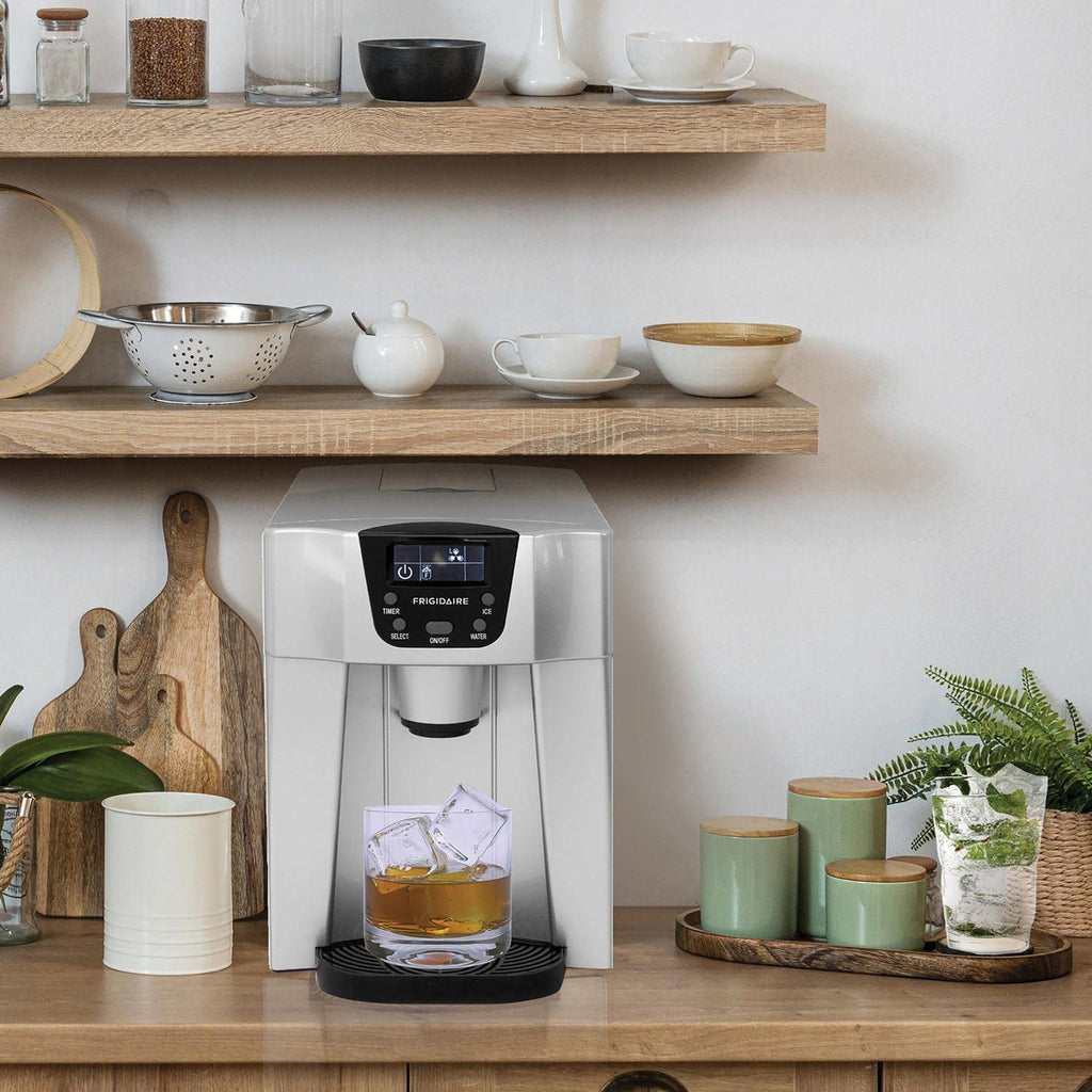 Do you hate buying ice and water bottles? Whether you have a small office, apartment, or dorm room, this personal Compact Ice Maker with Water Dispenser from Frigidaire is made for you. This countertop model has a water dispenser with a bottom drip tray to hold your glass or container. The ice maker part features 2 cube sizes so you can customize your ice to your drink and a 2.1-qt. reservoir so you can make plenty of ice ahead of time to have on hand. Electronic controls with an LED indicator mean you can put in your ice order with the touch of a button The water drip tray and cover will prevent messes, and when it’s time to clean up, you can easily empty the ice maker with the drain plug. For utmost freshness and hygiene, be sure to change the water in the reservoir every 24 hours. This ice maker is designed to produce ice, not store it. The unit does not keep ice frozen once it's made. To prevent melting, transfer the ice to your freezer promptly after it is produced.