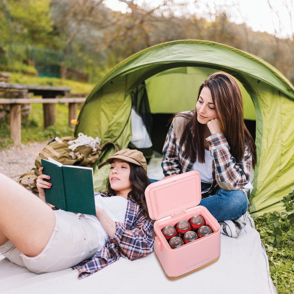 The Frigidaire Portable Top-Opening 6-Can Beverage Insulated Fridge/Cooler with Cork Detailing redefines versatility with its storage capacity, accommodating up to 6 cans or 4 liters of beverages for a total capacity of 0.14 cu. ft. Beyond refreshments, it offers an alternative purpose, serving as a stylish skincare fridge for moisturizers and beauty tools, infusing a rejuvenating cooling element into your daily skincare ritual. Its insulated design ensures your items stay refreshingly cool thanks to the advanced thermoelectric cooling system that maintains optimal internal temperatures. The cooler exudes sophistication with its leather-like carrying handle and elegant cork lid and details, while a heavy-duty rubber latch guarantees secure closure. Whether powered by a 110-volt wall outlet or a 12-volt car adapter for on-the-road convenience, its quiet and vibration-free operation ensures a tranquil cooling experience. Discover a world of convenience and versatility with the cutting-edge Frigidaire insulated cooler that redefines how you chill and store your favorite beverages and food items.