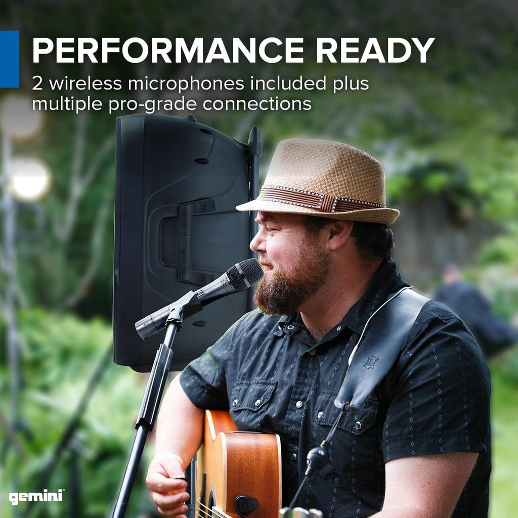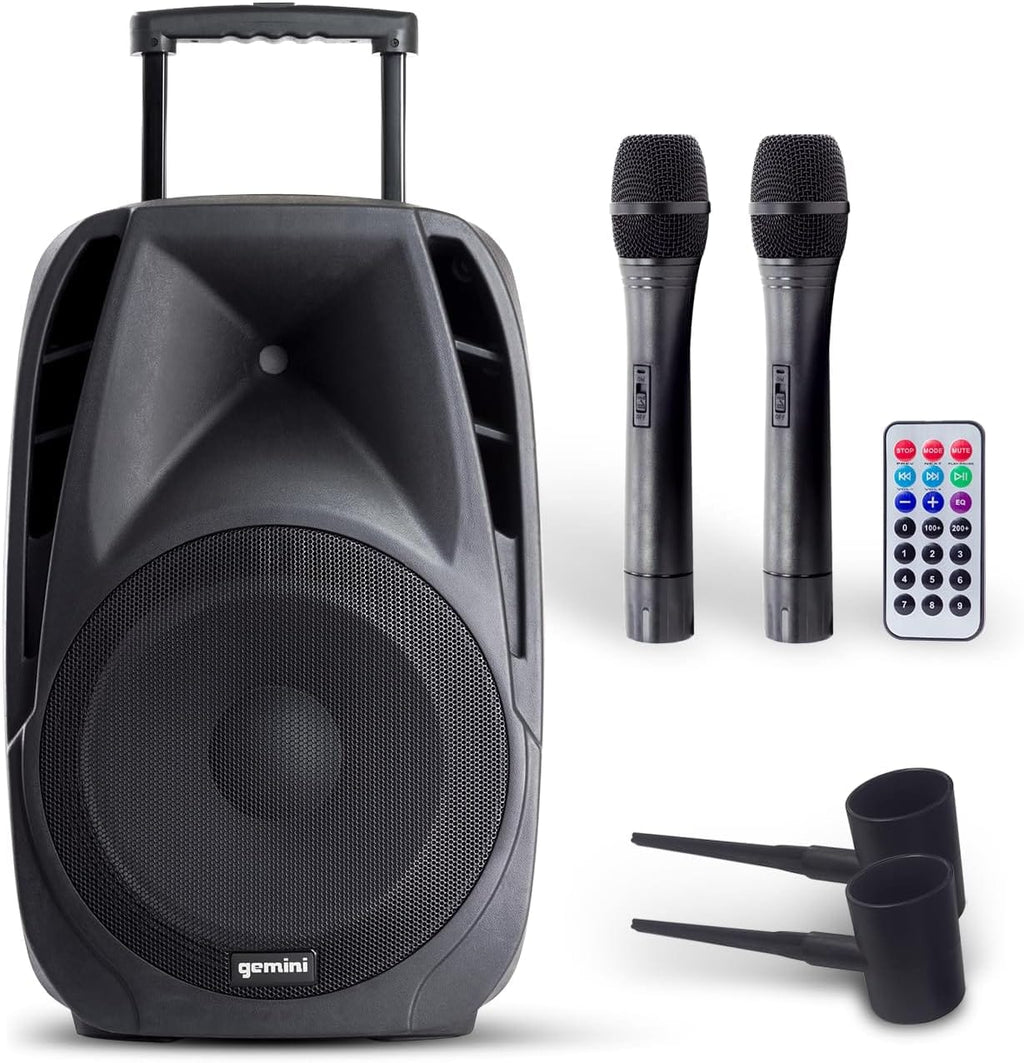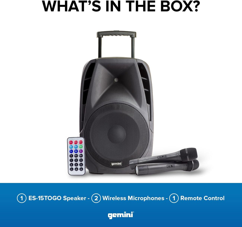 Get the Gemini’s best-in-class sound anytime, anywhere with the ES-15TOGO. Delivering huge power in a rugged compact speaker, this system is perfect for all types of venues. With its 800 watts of peak power and premium 15” Low-Frequency woofer, you get far-reaching, full range sound that’s crystal clear even when you’re streaming music wirelessly. Playback via Bluetooth®, USB, or SD card with on-board mixer puts you in complete control as you craft your sound while its built-in wheels and a retractable trolley handle make it perfectly portable. With assorted audio inputs plus 2 built-in wireless UHF receivers (microphones included) the ES-15TOGO has everything you need for an unforgettable event. Adjustable vocal echo effect will have you sounding like a pro! A true all-in-one system that is powerful, and rugged enough to be used for the most demanding performances.