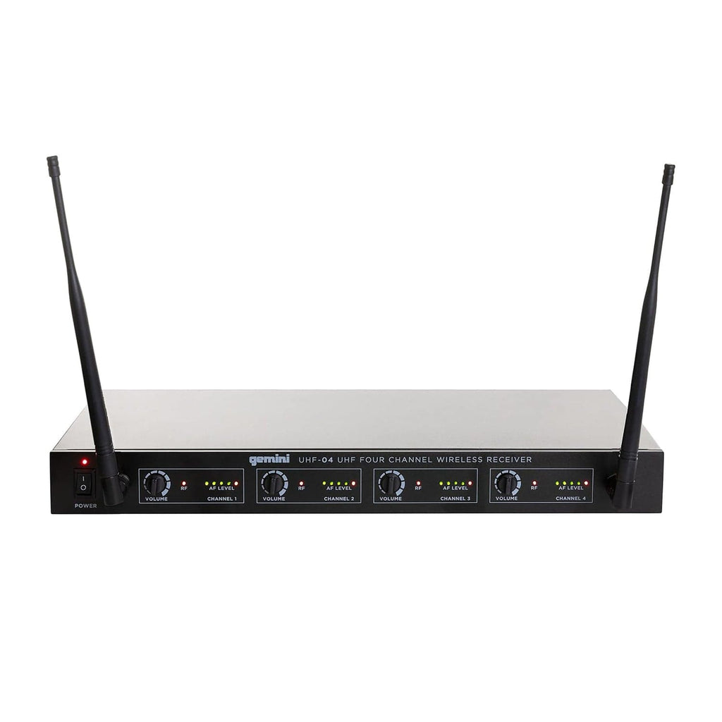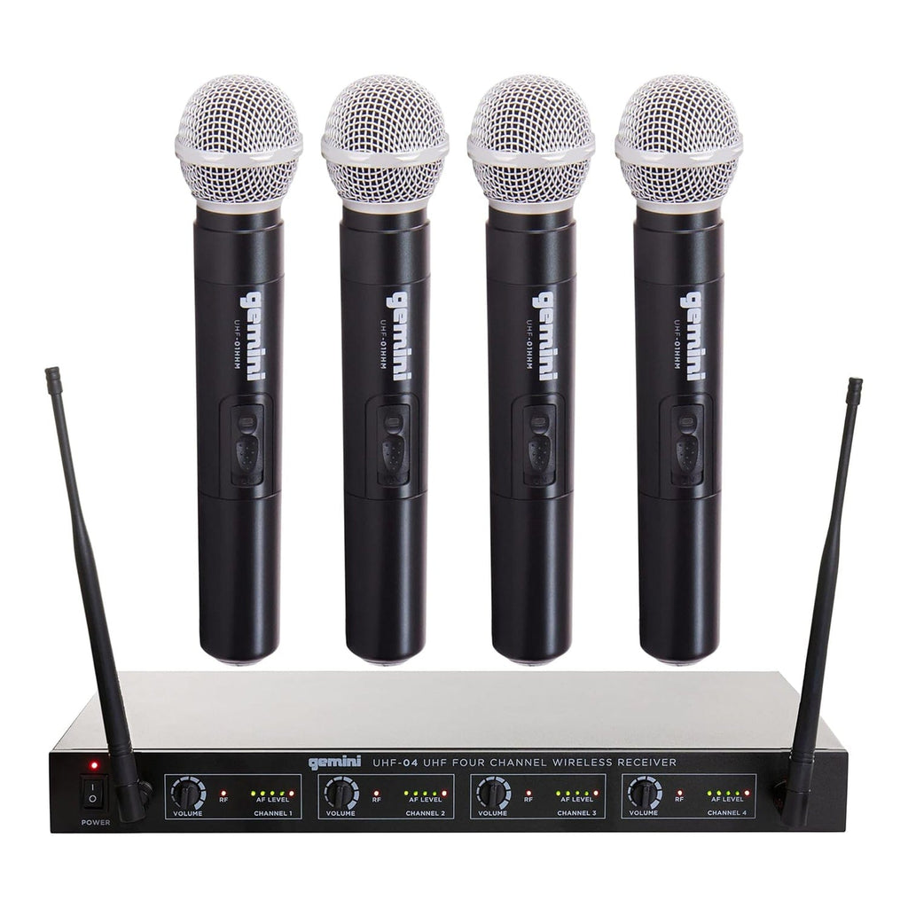 The Gemini Sound UHF-04M is the ideal solution for entertainers and bands who need a full wireless system and freedom to move on stage. The UHF-04M comes with 4 handheld wireless microphones offering high-quality voice reproduction with incredible clarity and reliability, at a point that can’t be beat. We’ve added in multiple bandwidths, offering you a wide range of frequencies to ensure you’ll always have excellent sound reproduction. The 4-channel receiver has individual volume rotaries and channel outputs as well as a summed output of all signals to easily integrate into your audio setup.