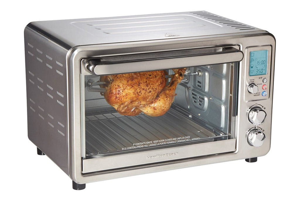 The Hamilton Beach Sure-Crisp Digital Air Fryer Toaster Oven with Rotisserie combines Sure-Crisp air frying functionality with the versatility of a rotisserie and classic toaster oven. You get the even crisping and browning of air frying right on your countertop, along with the ability to rotisserie, toast, bake and broil. Using little to no oil, the Sure-Crisp function turns fresh or frozen French fries, chicken wings, steaks, fish, vegetables and more into crispy deliciousness that you and your family will love. The Hamilton Beach Sure-Crisp Digital Air Fryer Toaster Oven provides plenty of cooking space and lets you rotisserie a whole chicken, cook a 12" pizza or toast 6 slices of bread. The intuitive controls include 6 settings to cover every cooking need and a digital LED panel to keep you informed about the preheating status, remaining cooking time and current temperature. The oven features 3 rack positions for cooking flexibility and it includes a mesh air-fry basket, rotisserie accessories, bake pan, broil rack and slide-out crumb tray.
