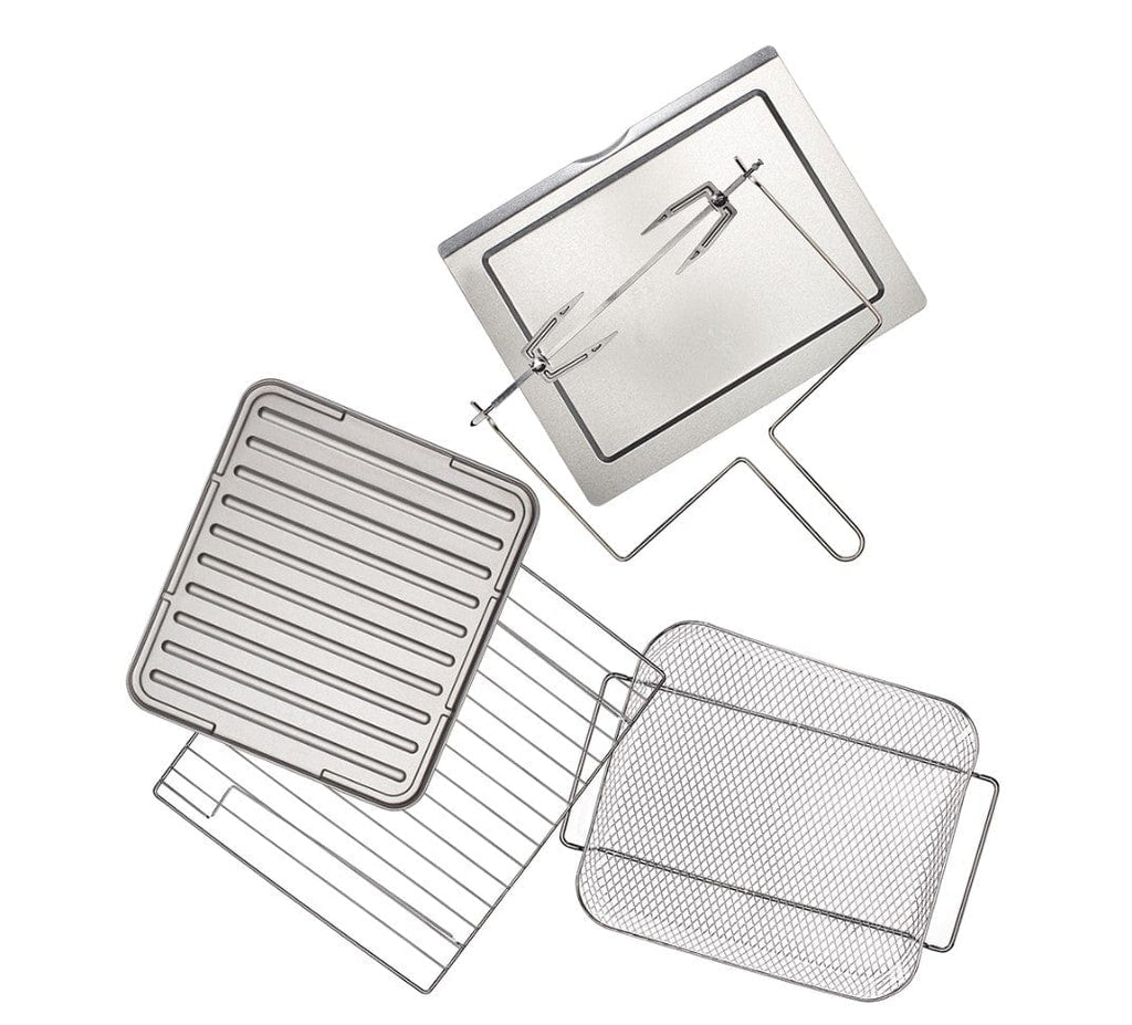 The air fryer oven comes with all the accessories you need to air fry, bake, broil, and toast, plus a slide-out crumb tray.