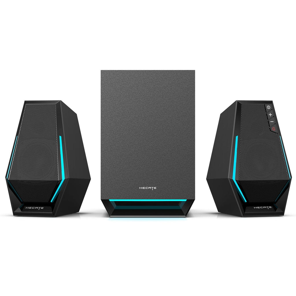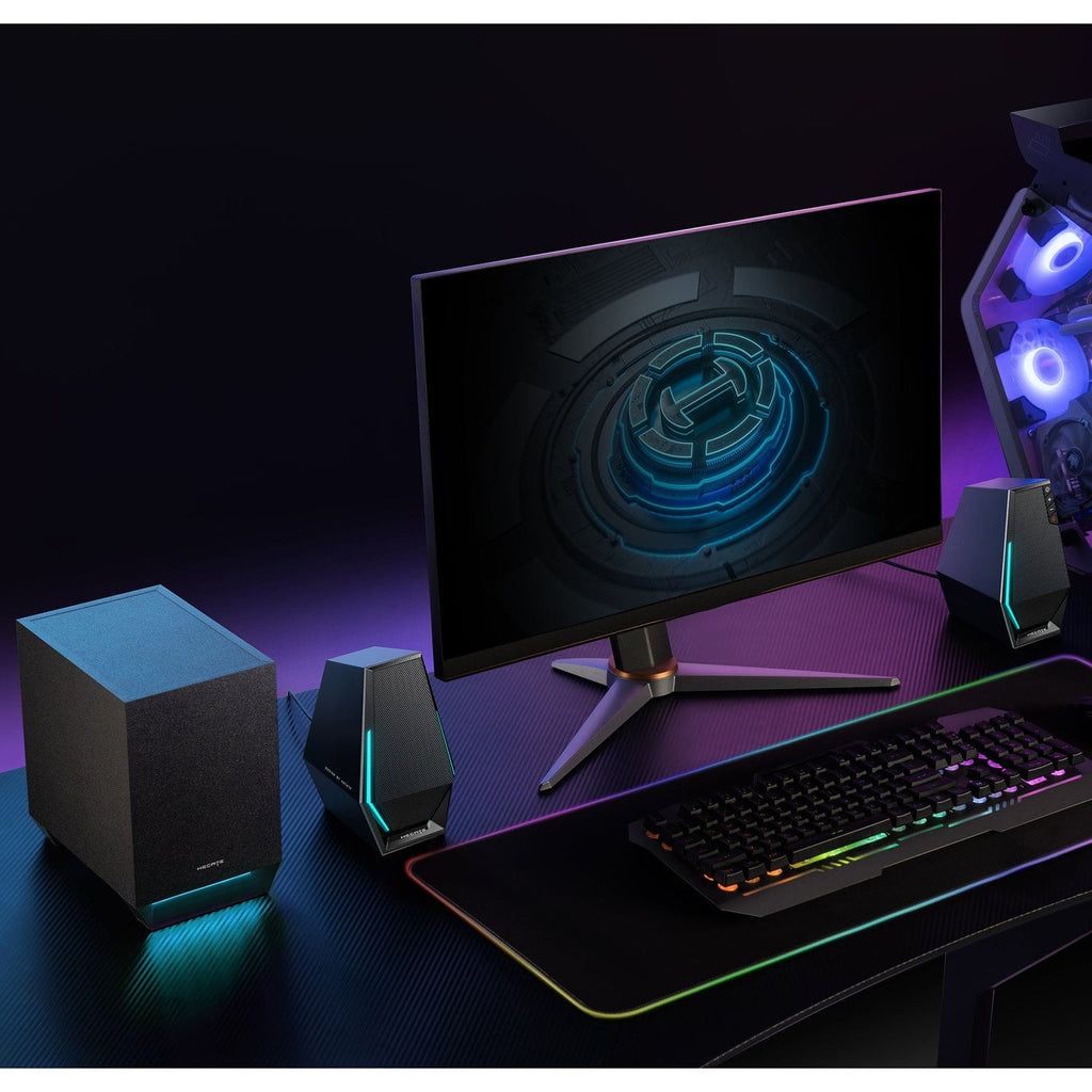 The Hecate by Edifier G1500 MAX 2.1 Gaming Speaker System boasts a peak power of 60 watts and ensures immersive audio experiences. With dual 2.5-in. full-range speaker drivers in each satellite, it produces superb sound quality. Complemented by a 4-in. subwoofer, the system delivers deep, impactful bass, enhancing the quality of music, movies, or games. Experience the realism of explosions, gunfire, and footsteps as if on a genuine battlefield. Equipped with 2.5-in. full-range drivers in both left and right channels, enjoy a balanced listening experience and heightened stereo sound quality. This gaming speaker system boasts 10 dynamic light effects and 16.8-million light colors synchronizing with the sound, creating an immersive experience where light and shadow dance to the rhythm. Easily customize your desktop ambiance with a single click, adding depth to your gaming setup and enriching your auditory journey.