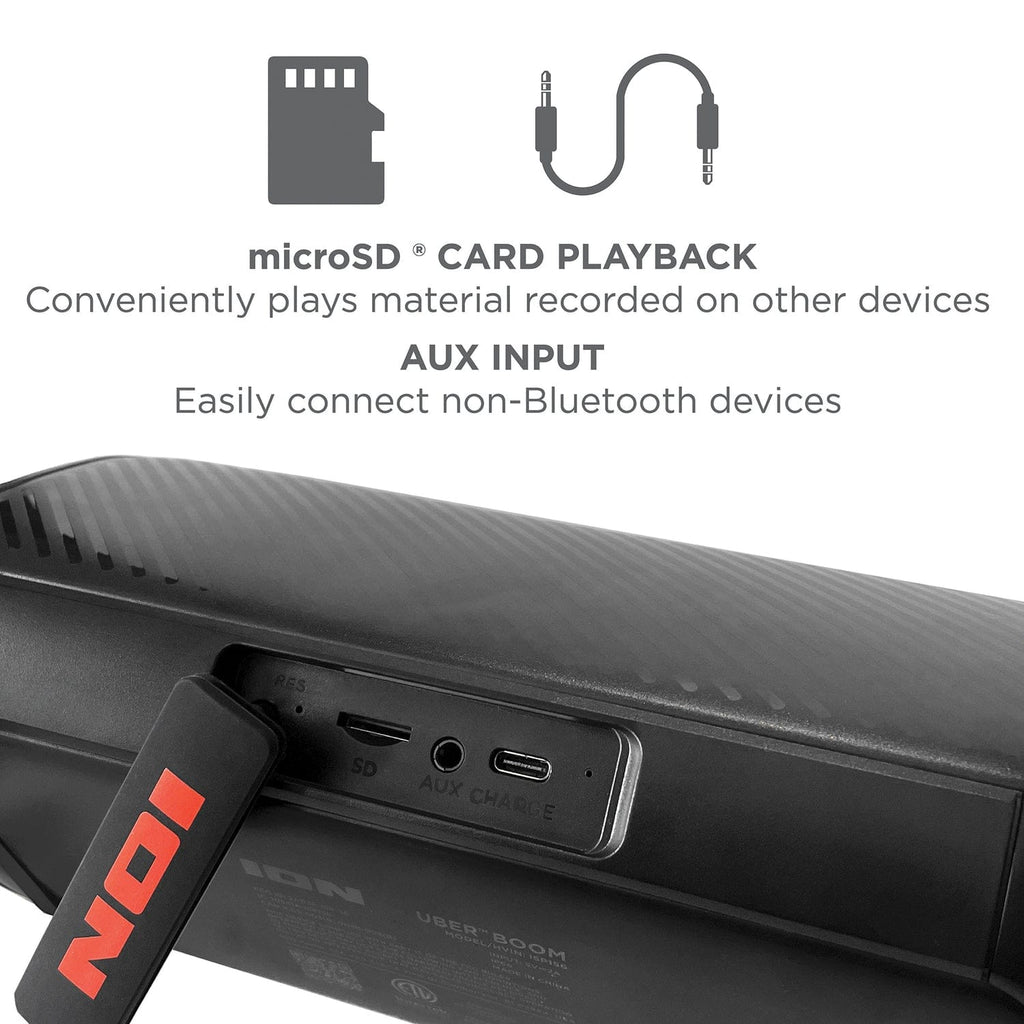 The ION Uber Boom Portable Bluetooth Speaker with LED Lights is designed to enhance your personal listening experience with its impressive features. The speaker lights move to the beat of your music, adding an extra element of fun, while the speaker’s long-lasting battery life of up to 10 hours provides ample power. It is also IP66 water-resistant and sandproof, so accidental spills, splashes, or sand won’t cause damage. The wireless speaker also features Stereo Link, which enables you to connect an additional Uber Boom for an even more immersive audio experience. The speaker also has SD Card playback so you can conveniently play material recorded on other devices. And the aux input allows easy connectivity to non-Bluetooth devices. The ION Sound Control app allows you to customize the audio and lighting. The speaker boasts a high-power 40-watt sound system with dual 2.25-in. full-range speakers and 2 passive radiators to deliver lifelike sound quality and fill a room with sound. Finally, the built-in microphone provides hands-free call answering. The Uber Boom portable wireless speaker is an ideal choice for music lovers who want to elevate their audio and visual experience. Indoors or outside, this portable Bluetooth boombox-style speaker will put the ‘boom boom’ into your music in any environment.