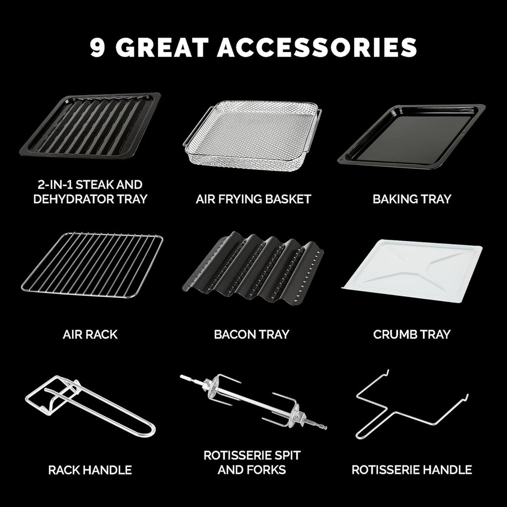 - ENJOY 9 DO-IT-ALL ACCESSORIES — MAXX-IMIZE your cooking possibilities! A versatile collection of accessories includes an air frying basket, baking tray, air rack, crumb tray, bacon tray, steak tray, rotisserie spit & forks, rack handle, and rotisserie handle. Plus, a bonus cookbook featuring a diverse assortment of easy-to-follow, chef-inspired recipes
