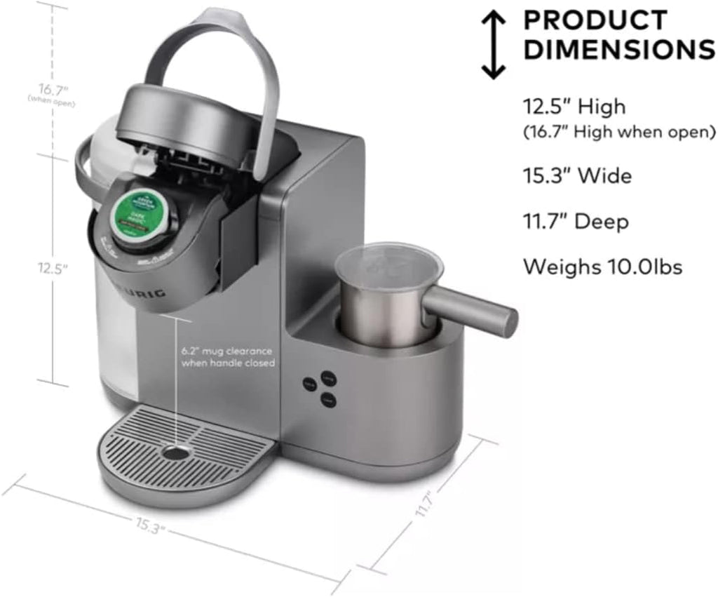 Enjoy the rich, full-flavored coffee you love or delicious coffeehouse beverages from the Keurig K-Café C single serve coffee, latte, and cappuccino maker. Featuring metal details and a premium nickel colored finish, the K-Café C brewer is a stunning addition to your kitchen. Whether brewing coffee, or making lattes, and cappuccinos, the K-Café C brewer works with any K-Cup pod so the options are endless. Use the coffee SHOT to brew a concentrated shot of coffee and froth your choice of fresh milk to create a creamy latte or frothy cappuccino. Enjoy your latte or cappuccino hot or use the COLD setting to froth cold milk for a wonderfully refreshing iced latte or cappuccino. Brew 6, 8, 10, or 12oz of your favorite coffee, tea, or cocoa – select Strong Brew when you want a bolder cup of coffee. The dishwasher safe frother makes clean up a breeze – enjoying delicious specialty beverages at home has never been so easy. Just brew, froth, enjoy!