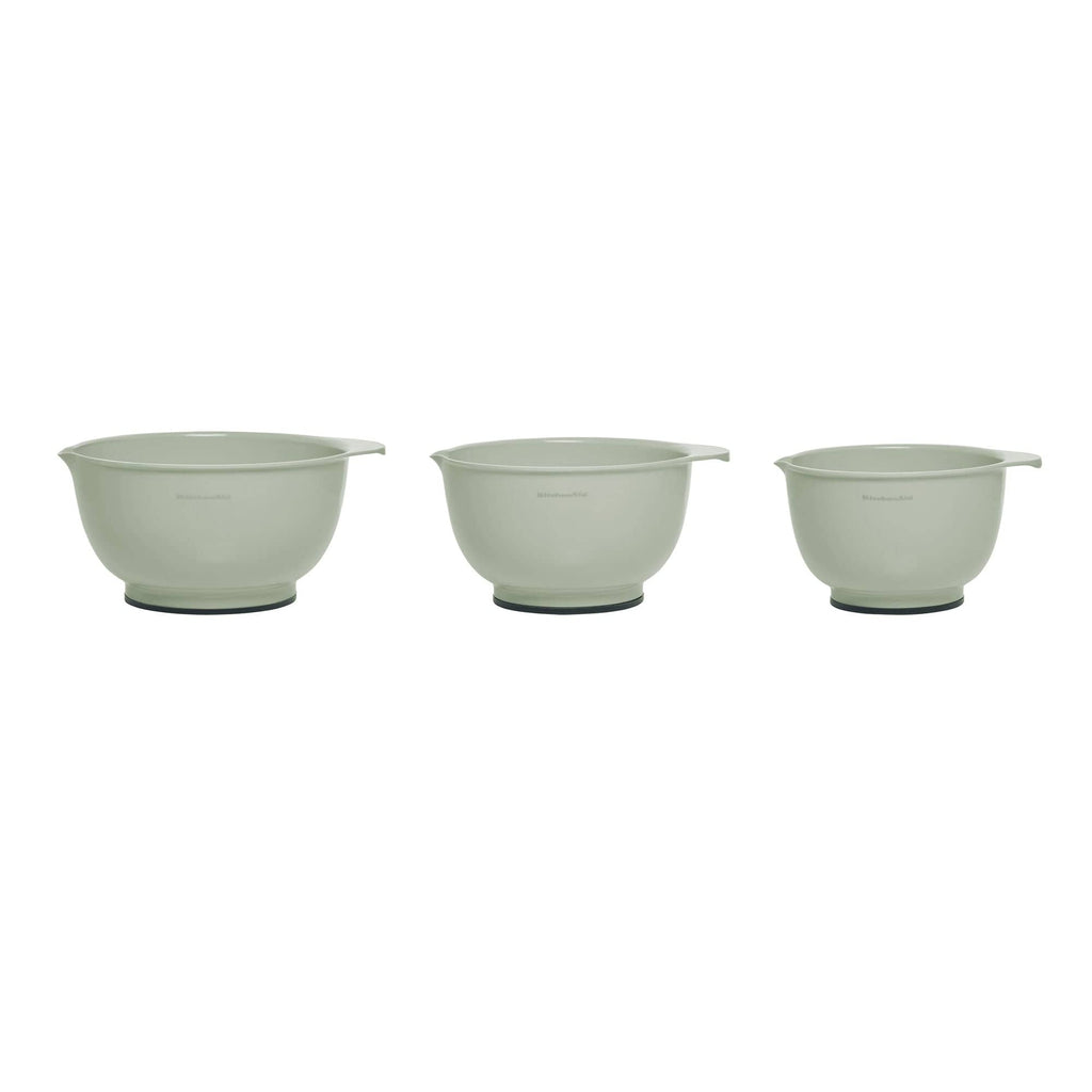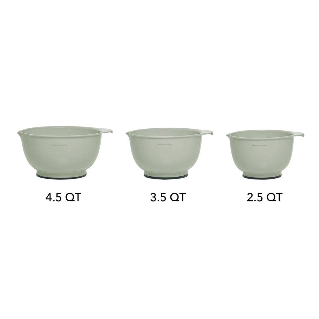 These KitchenAid mixing bowls are essential tools for any modern kitchen. This set includes one 2-1/2 quart bowl, one 3-1/2 quart bowl and one 4-1/2 quart bowl. These bowls feature non-slip bases that increase stability while mixing. The pour spout on each bowl helps reduce spills when transferring mixes. These bowls nest together when not in use for easy storage. These mixing bowls are dishwasher safe for fast and easy cleanup. One year hassle-free replacement and lifetime limited.