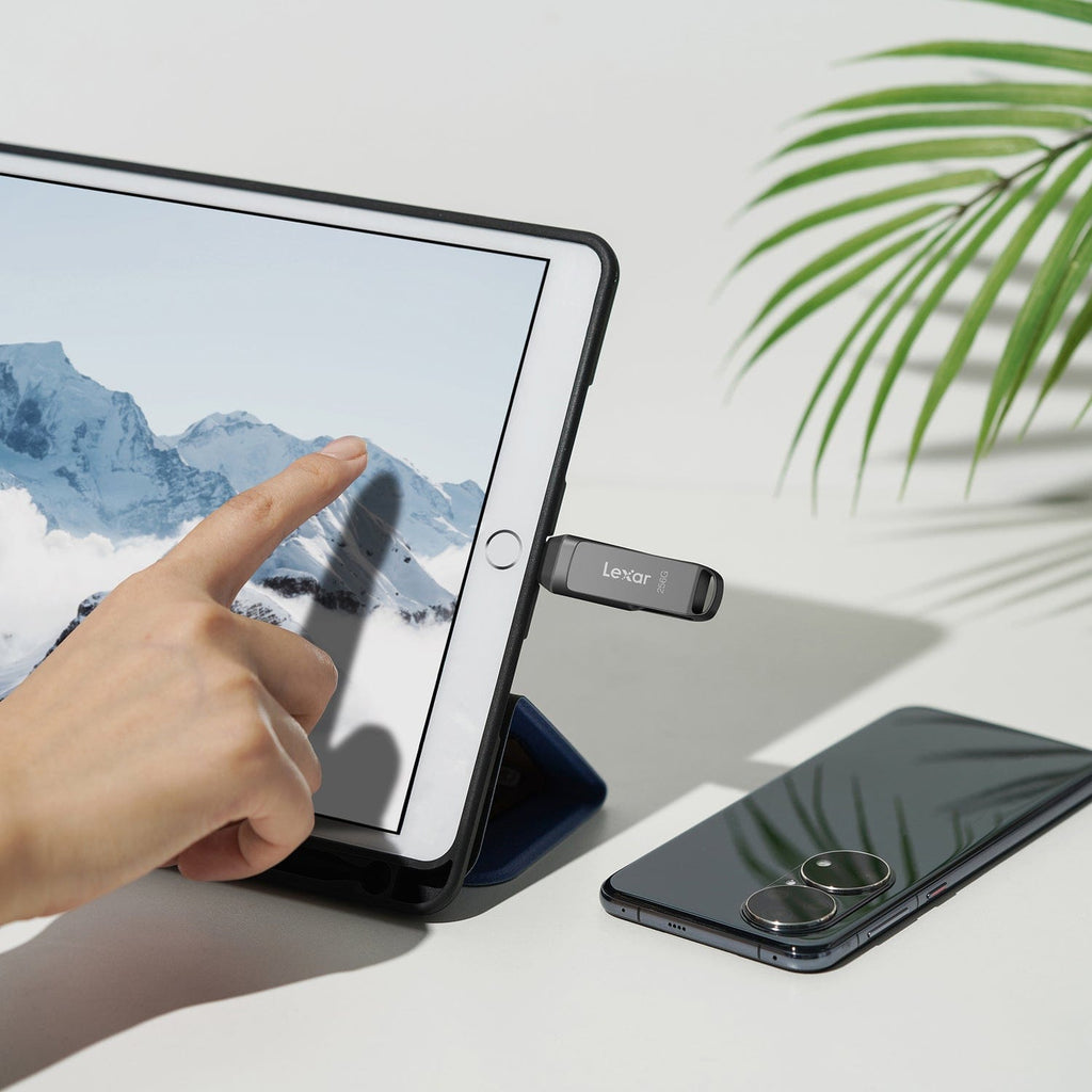 The Lexar JumpDrive D400 Dual Drive is a 2-in-1 flash drive that allows you to seamlessly transfer content between your USB-C and USB-A devices. Featuring a stylish metal casing and swivel design for added protection, this drive is as tough as it is fast, with read transfer speeds up to 170 MB per second. The USB drive is compatible with Android, PC, and Mac systems and provides the opportunity to protect its contents with a password.