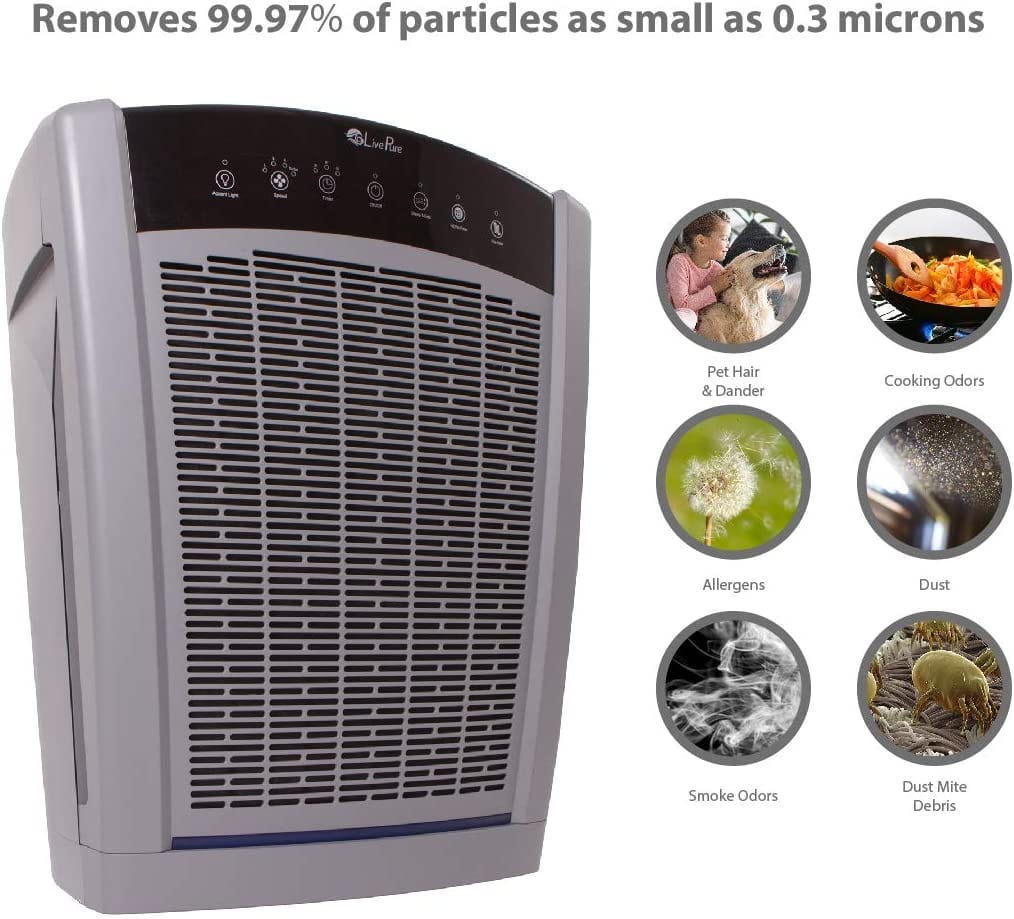 - True HEPA filter removes up to 99.97% of airborne particles as small as 0.3 microns including smoke, dust, pollen, pet hair and dander, mold spores and dust mite debris