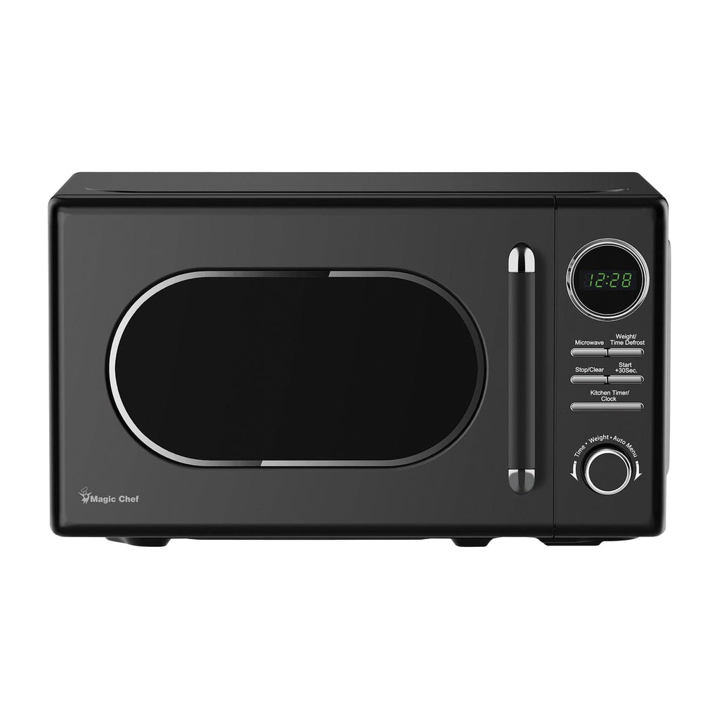 The Black Magic Chef 0.7-Cu. Ft. Microwave has a classic retro design and will be the ideal addition to any kitchen, dorm room, or office. The LED display clearly shows the time and easy-to-use push buttons and knob control let you select your options. Choose from 10 power levels and 9 auto-cook menu options which include popcorn, beverage, vegetable, meat, pizza, potato, pasta, soup, and reheat. There are auto-defrost menus for both time and weight. A glass turntable ensures food is evenly cooked. Multistage cooking lets you set up 2 stages of cooking so you can easily defrost and then immediately start cooking your food. ECO mode reduces stand-by power by turning off the display when the microwave is not in use. You can also mute the microwave so it will not beep, which is ideal for nap time or when you’re on a call. This microwave combines the retro look with all the modern conveniences of today!