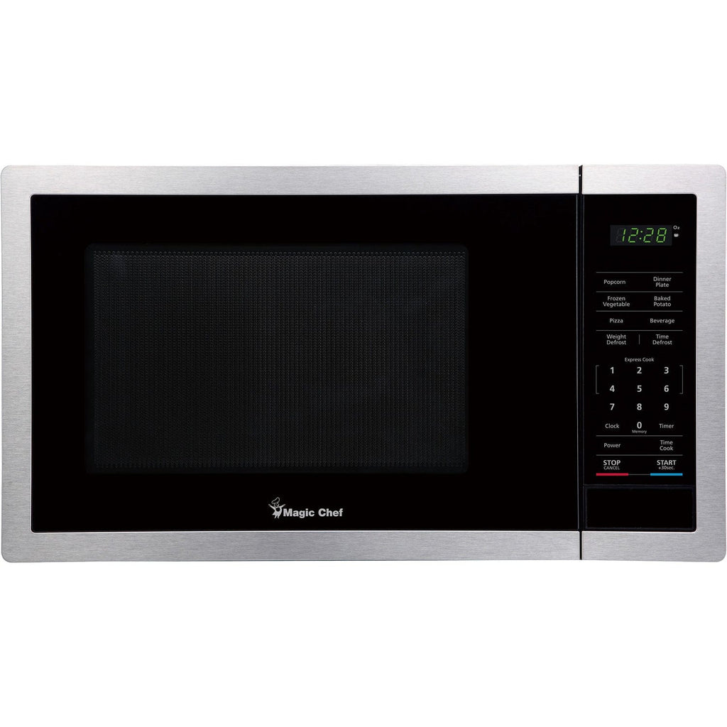 The Silver Magic Chef 0.9 Cu. Ft. Countertop Microwave is designed to perform all your heating and cooking needs in 1 compact piece of equipment that will fit into any kitchen, dorm room, or office environment. This device has 11 power levels to accommodate different heating needs. The digital display is easy to read and the handy kitchen timer is a must-have for any cook in the kitchen. It features user-friendly controls, including express-cook buttons and auto defrost options for weight and time. There are 6 auto cook menus for commonly microwaved items and include popcorn, dinner plate, pizza, baked potato, beverage, and frozen vegetables. This Magic Chef microwave is also designed to have an "add 30 seconds" button. As a safety measure, it has a child safety lock to avoid unintended use of the microwave. This microwave comes with a 1-year parts and labor warranty and a 5-year compressor part warranty.