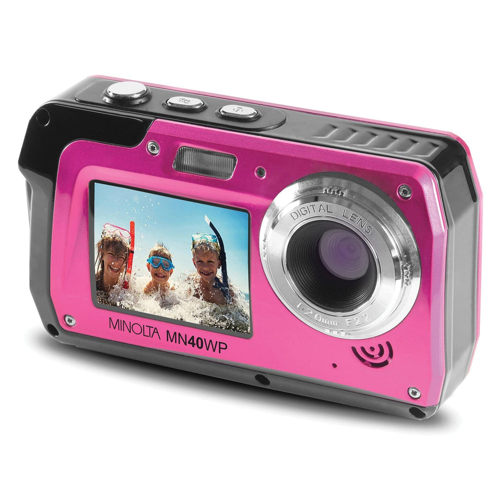 The Minolta 48 Megapixel Waterproof Digital Camera in Pink shoots 48 megapixel pictures and 2.7K Ultra HD video. It features a compact size, 16x digital zoom lens, 3 in. rear TFT LCD screen and 2 in. front TFT LCD screen. The front screen can be used as a self-timer screen with face recognition technology, so you can easily take the ideal selfie. Special features including panorama shooting, face detection, and smile capture make shooting the ideal shot easy. A built-in flash provides the ideal lighting, while anti-shake image stabilization delivers a steady and smooth picture. Waterproof functionality at up to 10 ft. of depth lets you capture amazing underwater photos.